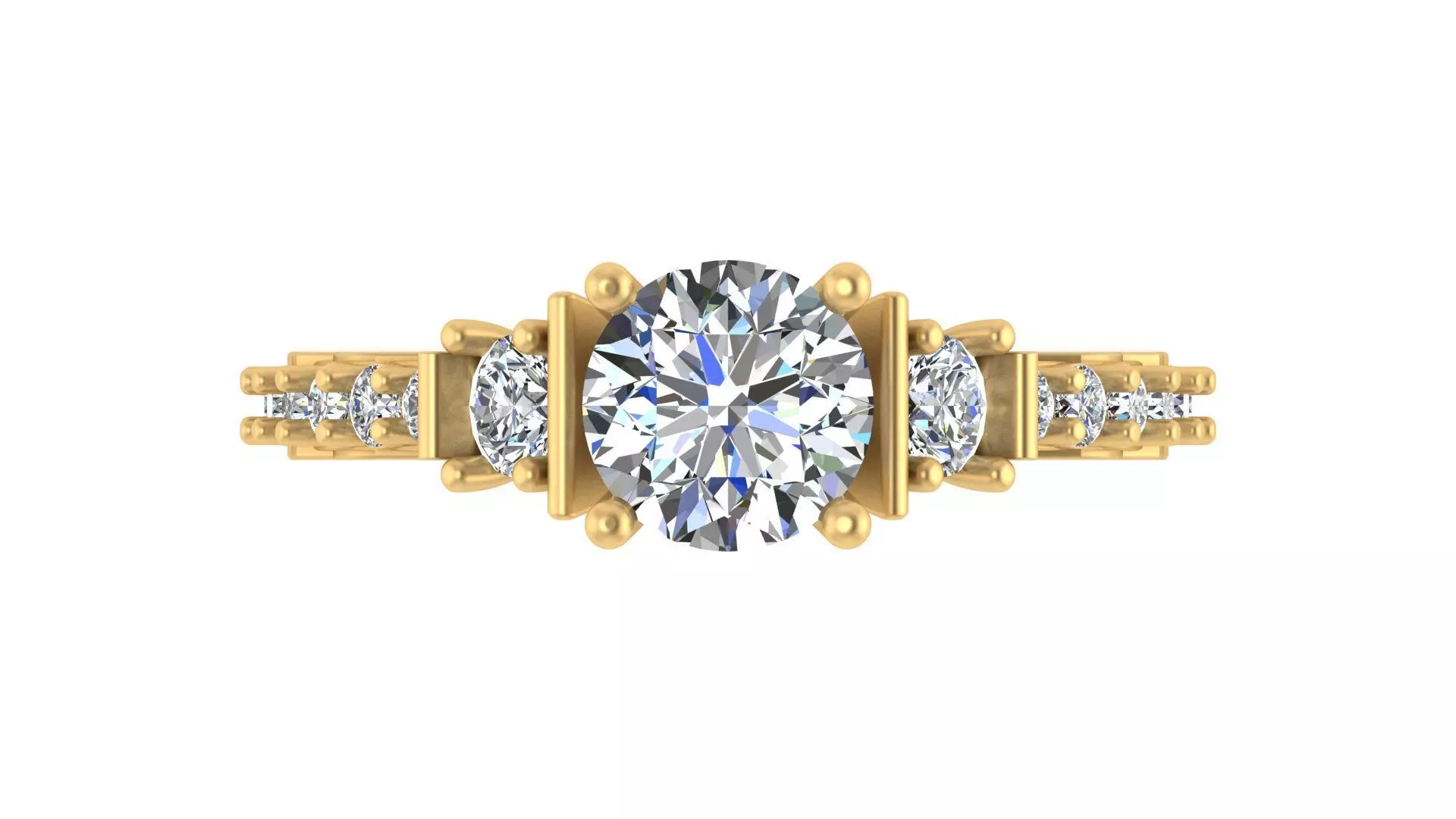Measurements & Specifications:Top Width: 6.5 mmBand Width at Bottom: 1.75 mmSide Profile Height: 2.4 mmInner Diameter: 16.5 mmMaterial & Weight:18K Gold: 4.95 CAD WT14K Gold: 4.36 CAD WTGemstone Details:8 stones (1.60 mm round-cut, 0.12 total carat weight)8 stones (1.80 mm round-cut, 0.13 total carat weight)2 stones (3.20 mm round-cut, 0.25 total carat weight)4 stones (1.00 mm round-cut, 0.15 total carat weight)2 stones (1.30 mm round-cut, 0.016 total carat weight)1 center stone (6.5 mm round-cut, 1.03 total carat weight)This elegant engagement ring is designed for those who appreciate classic beauty with modern refinement. The three-stone setting, combined with a dazzling pave-set band, makes it a timeless piece that will be cherished for generations.