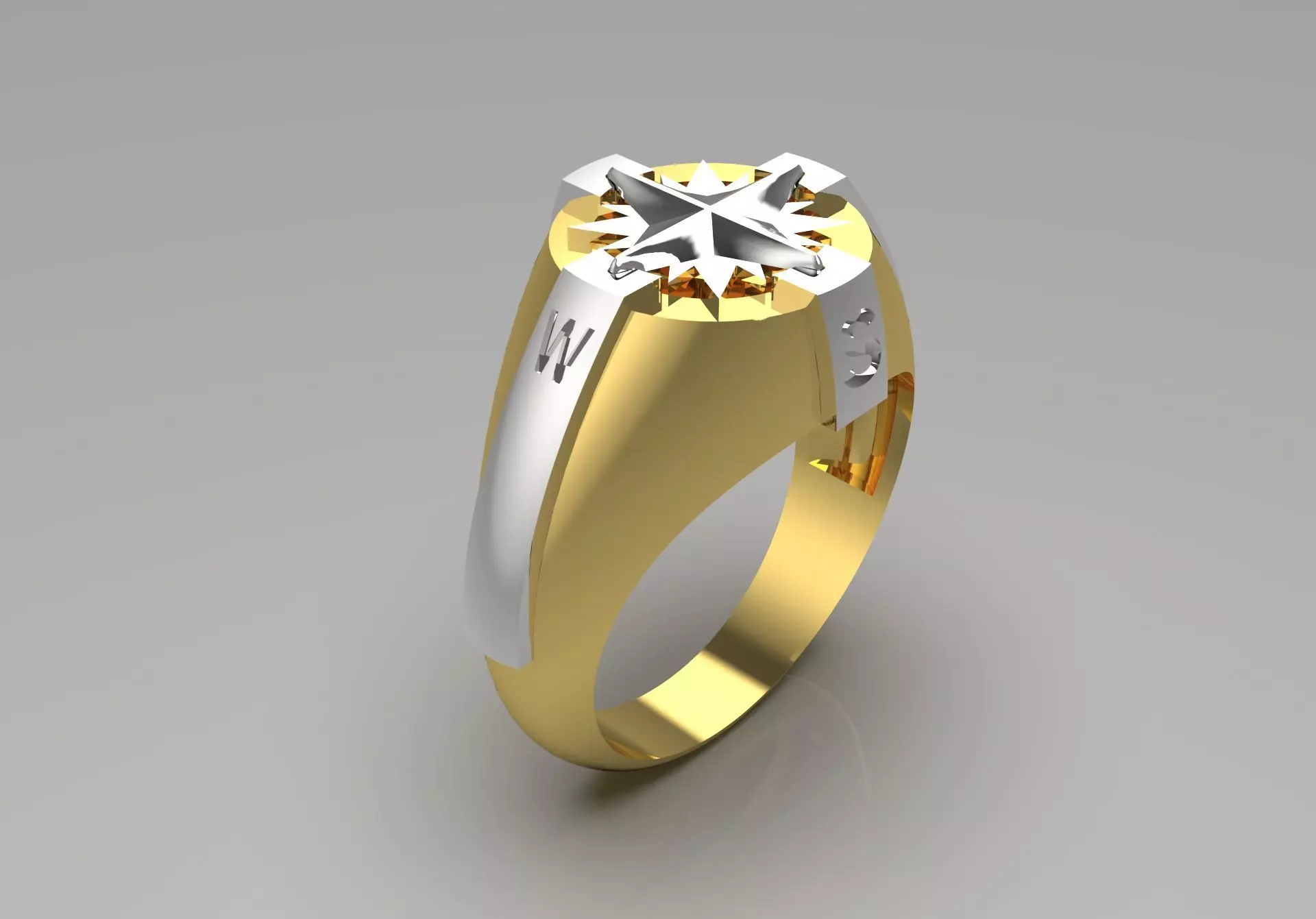 On the sides of the band, the letters “W” and “S” are engraved, which can represent a symbol of direction or personal significance. The juxtaposition of the shiny gold and white gold metal not only emphasizes the main elements of the design, but also offers a contemporary feel, making this ring suitable for both formal and informal settings.