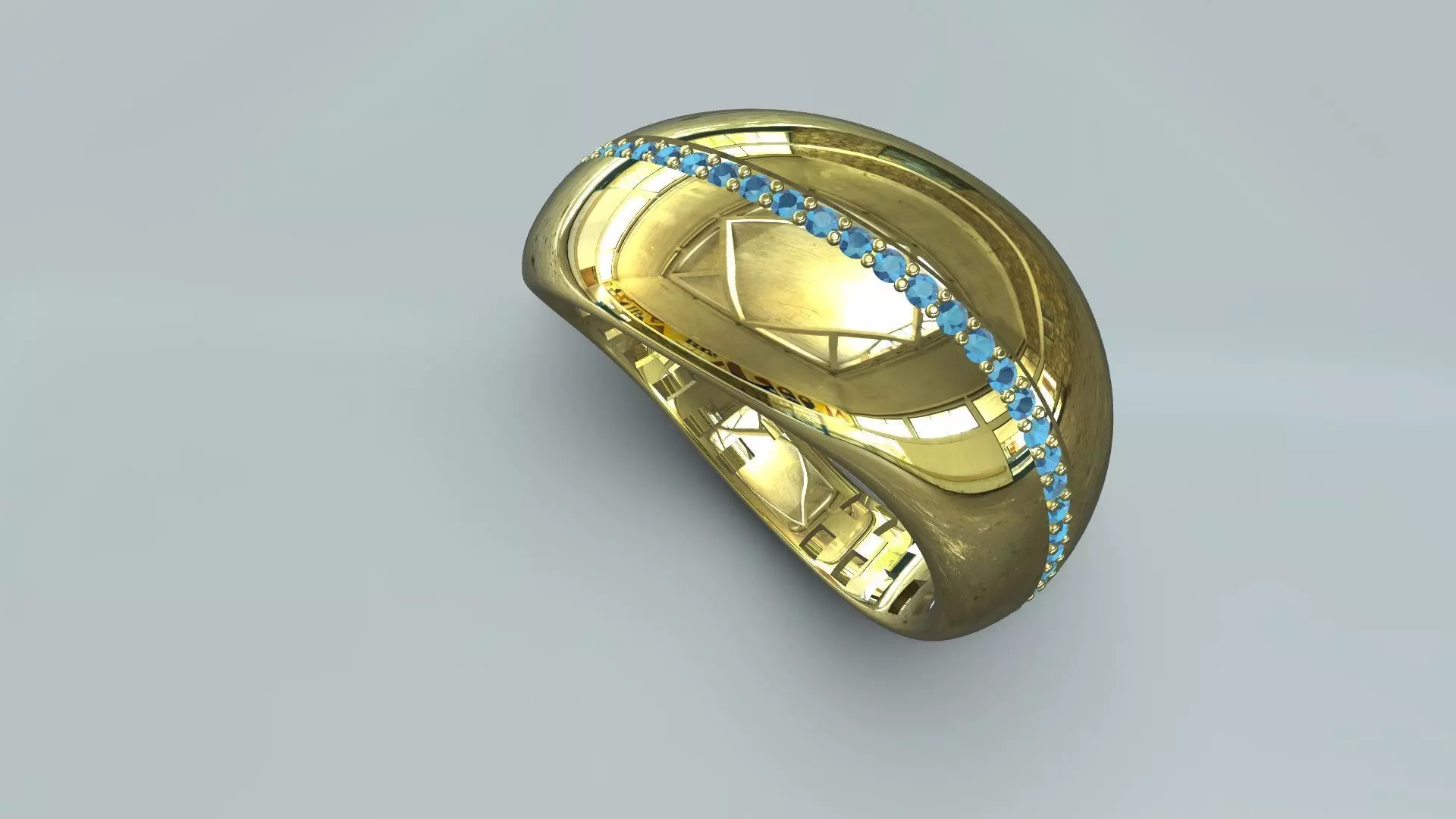 Merging bold architectural volume with delicate gemstone detailing, this wide statement ring features a modern concave profile that elegantly hugs the finger. The expansive, mirror-polished 14K gold surface is accented by a precision-engineered diagonal channel, set with a continuous row of vibrant blue gemstones. This professional CAD model is optimized for high-fidelity 3D printing and investment casting, ensuring that the channel walls remain crisp for secure stone setting while the smooth internal bore provides a premium comfort-fit experience. The result is a vanguard piece that balances clean geometric lines with a sophisticated splash of color.
