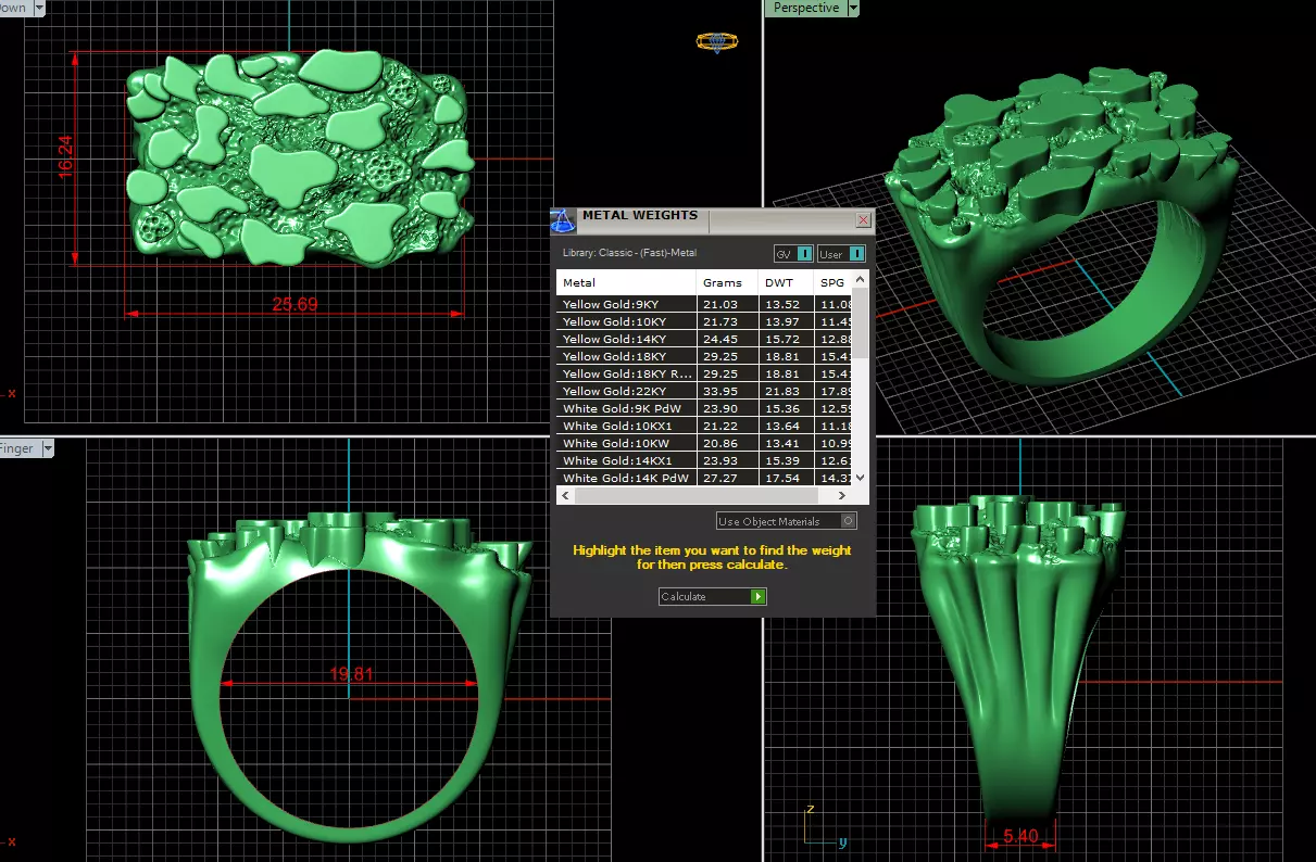 Dimensions• Ring inner diameter: 19.81 mm (US size equivalent)• Top width: 25.69 mm• Top height: 16.24 mm• Shank thickness: optimized for casting• Fully sculpted coral texture on top