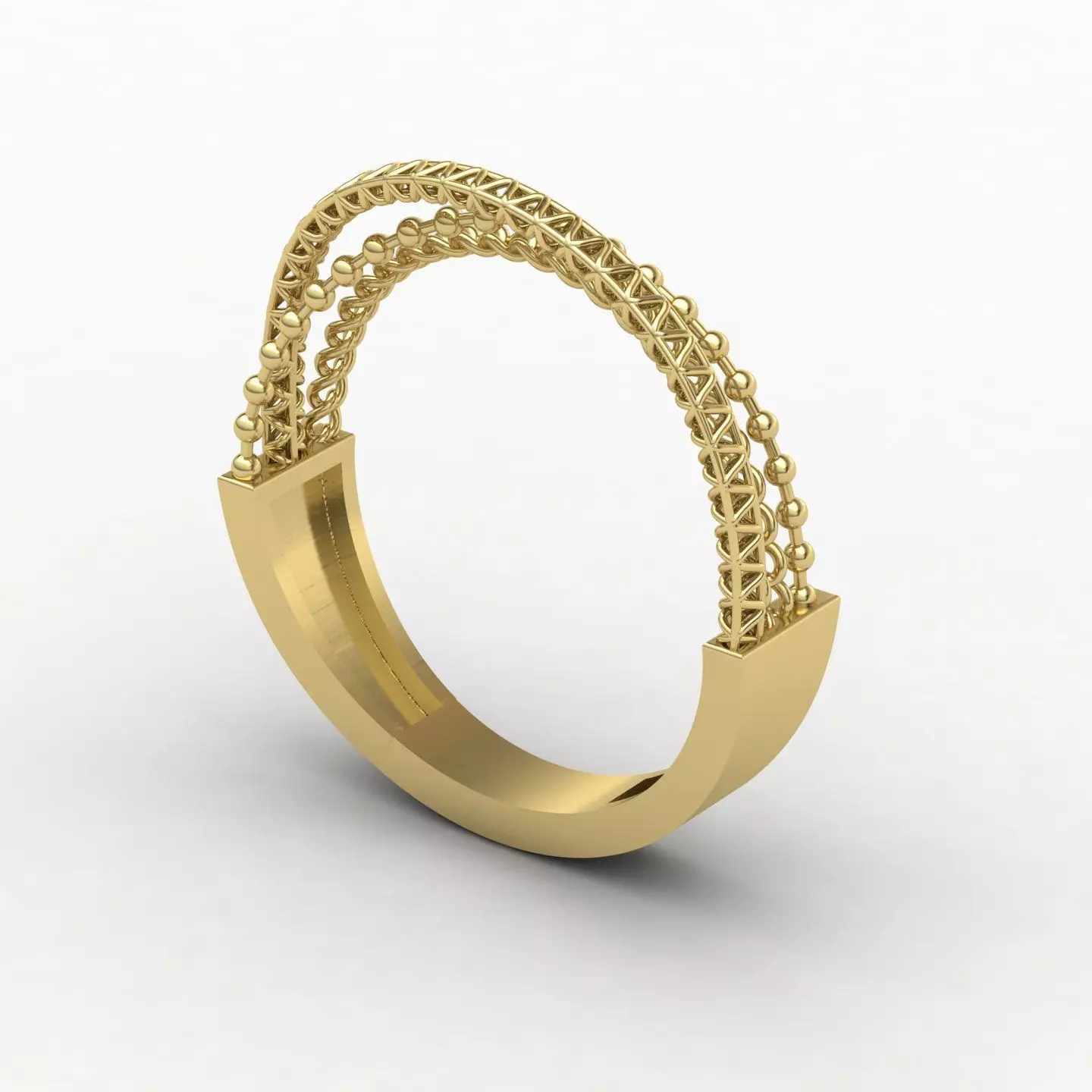 CrossOver ring model (size 55) with a minimal base and various decorative designs on the top including beads, chains, twisted bars, simple bars or gemstones. Clean topology, realistic dimensions and ready for production or rendering.Size 55Weight in 18k yellow gold 2.61 grams.Shank thickness 650 microns.Includes OBJ, FBX, STL, 3DS and 3DM.High resolution preview images.ApplicationsSuitable for:Jewelry making3D printingCNC millingRendering for catalogs, advertising and e-commerceNotesAll models are modeled without deformation.They can be resized to any ring size upon request.Visit my page to see similar examples.