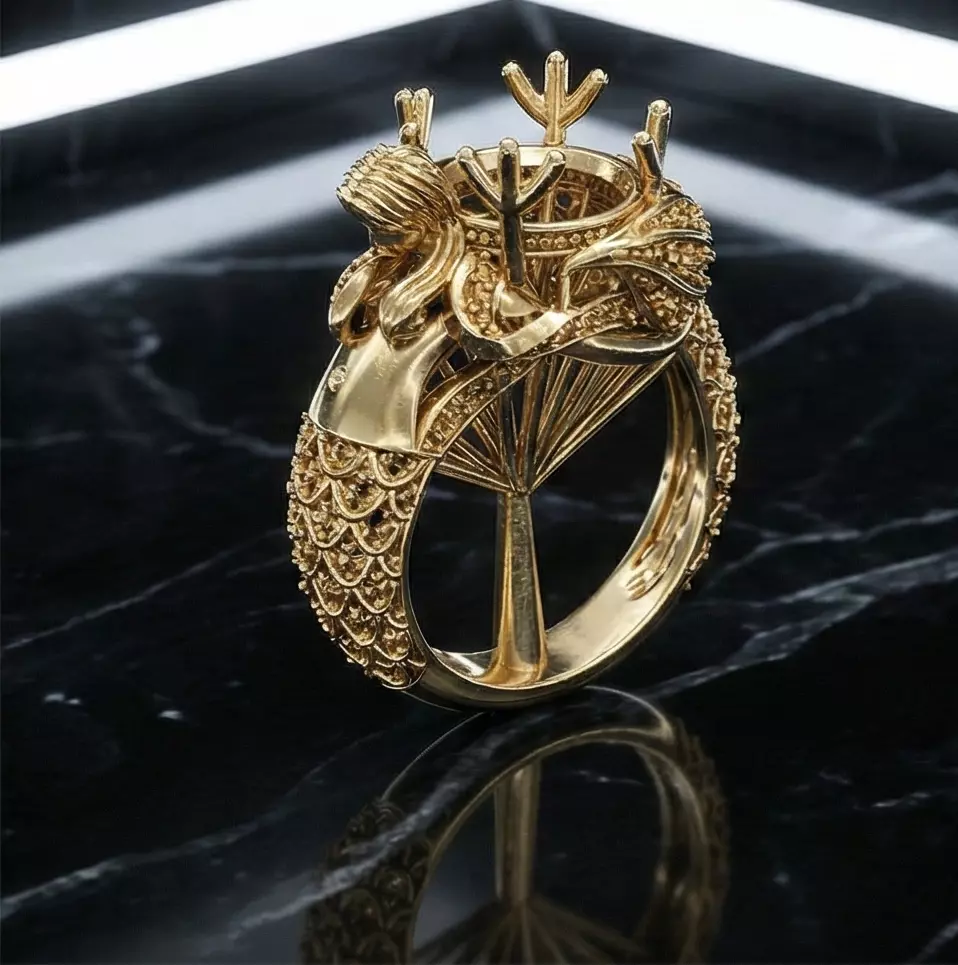 This ring is an ornamental, crown-inspired jewelry design featuring an integrated mermaid (mythical sea figure) motif on the side, combined with an elevated crown-style top structure.The composition blends symbolic fantasy elements with architectural jewelry construction, resulting in a visually rich yet balanced ring suitable for statement and collection-based designs.
