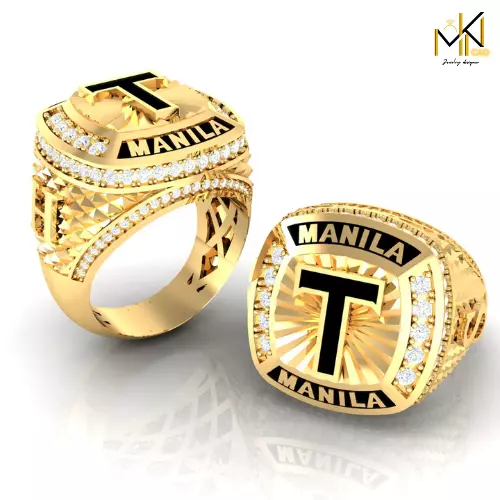 This high-detail custom championship ring 3D model features a bold T initial design and the word MANILA prominently engraved on the face and sides. The ring is set with pavé-style diamond accents and an elegant sunburst background on the top surface, giving it a luxurious and prestigious look.