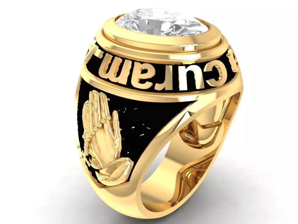 This 3D model features a detailed religious graduation ring for men, showcasing a symbolic praying hands motif on one side and elegant lettering on the band.
