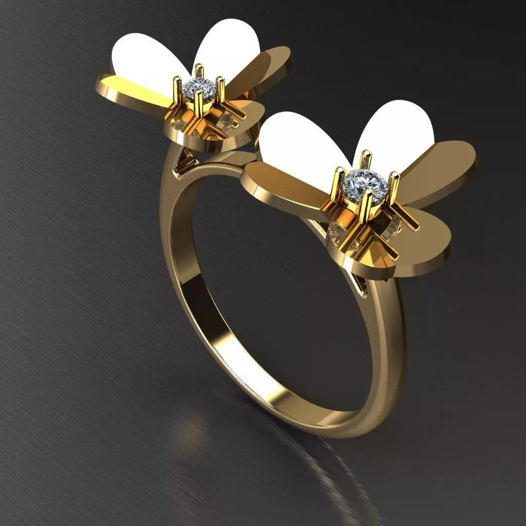 A delicate and elegant ring design inspired by the beauty of butterflies. The piece features two graceful butterfly motifs, each adorned with a sparkling round diamond at the center. The combination of smooth polished metal and fine detailing gives the ring a sense of lightness and luxury.