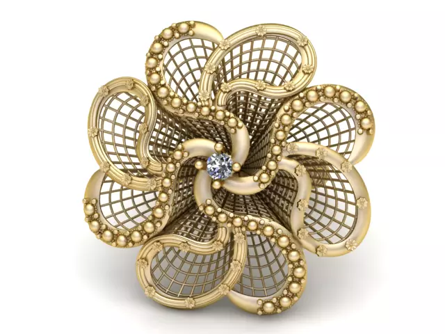 This breathtaking statement ring features a bold floral design crafted in gold, with delicate mesh-style petals outlined in shimmering white stones. At its heart lies a vivid green gemstone, adding a refreshing pop of color. The complex structure and openwork detail make it a showstopper for formal events, high-end collections, or custom couture jewelry.