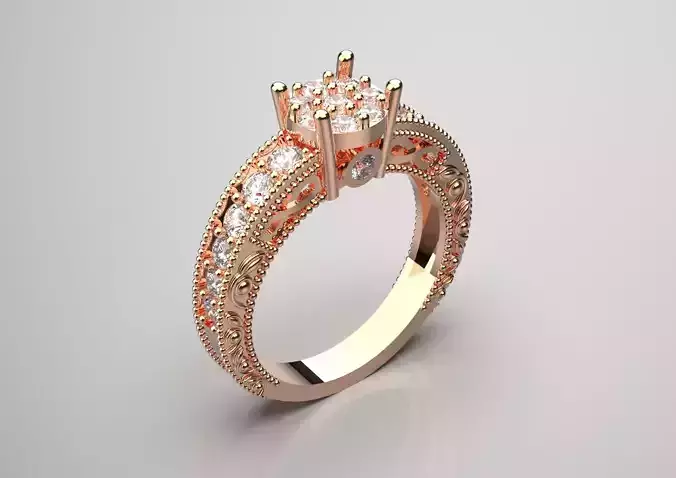 The ring is accented with a cluster of small, sparkling stones in the center in the shape of a flower that mimics a larger stone.The arm is adorned with smaller, round stones arranged in a row along the top, adding to the overall sparkle. The sides of the arm feature delicate scrolls and beaded details that add vintage charm.The warm tone of the rose gold complements the sparkle of the stones, creating a romantic and luxurious look.Overall, this ring strikes the perfect balance between classic elegance and contemporary design, making it a stunning choice for an engagement ring or a special occasion piece.