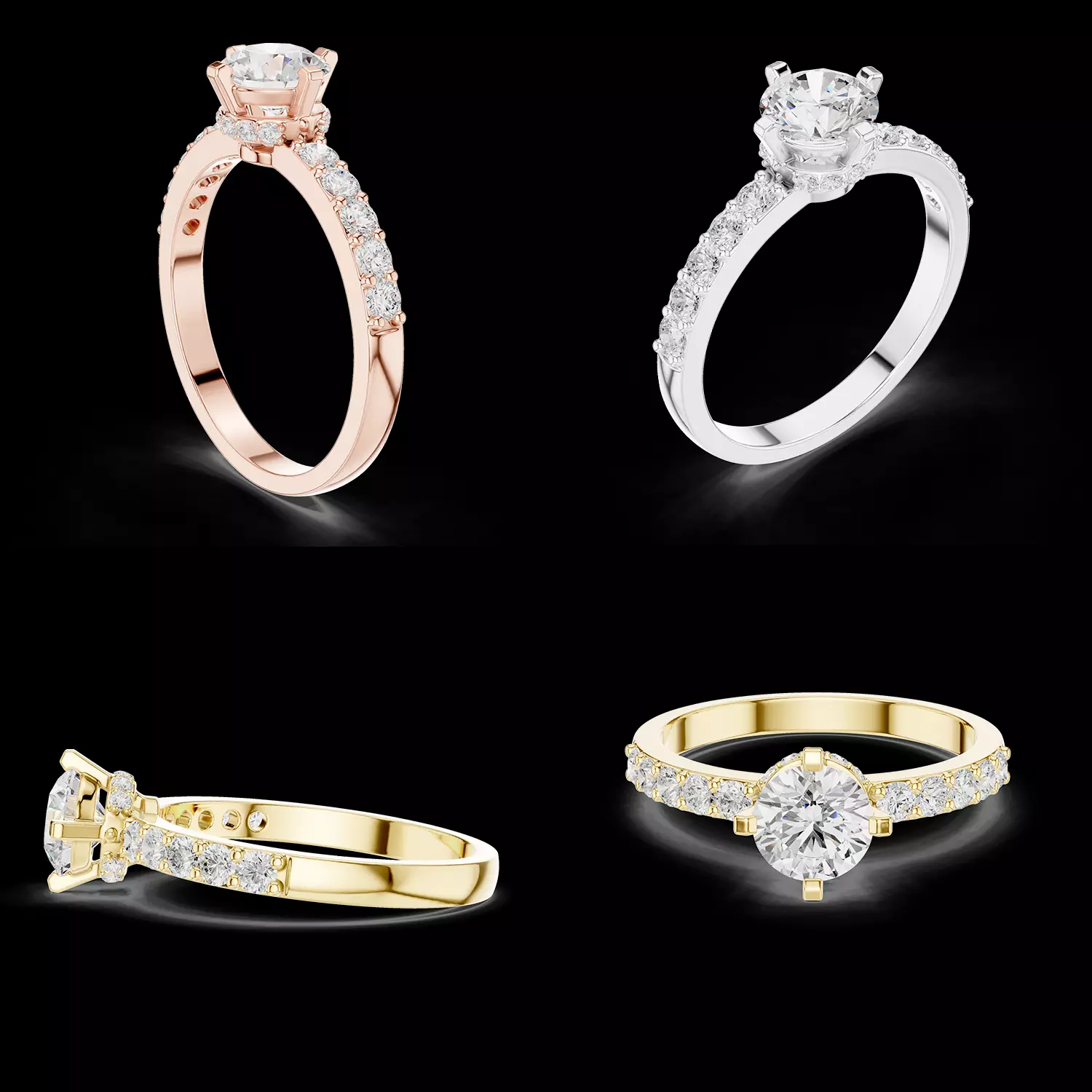 This elegant diamond ring 3D model combines a classic solitaire center stone with a delicate halo and a diamond-accented shank, creating a refined and luxurious engagement ring design. The round center stone is secured in a strong prong setting, while a subtle halo detail beneath the head adds extra brilliance and visual depth without overpowering the main stone.