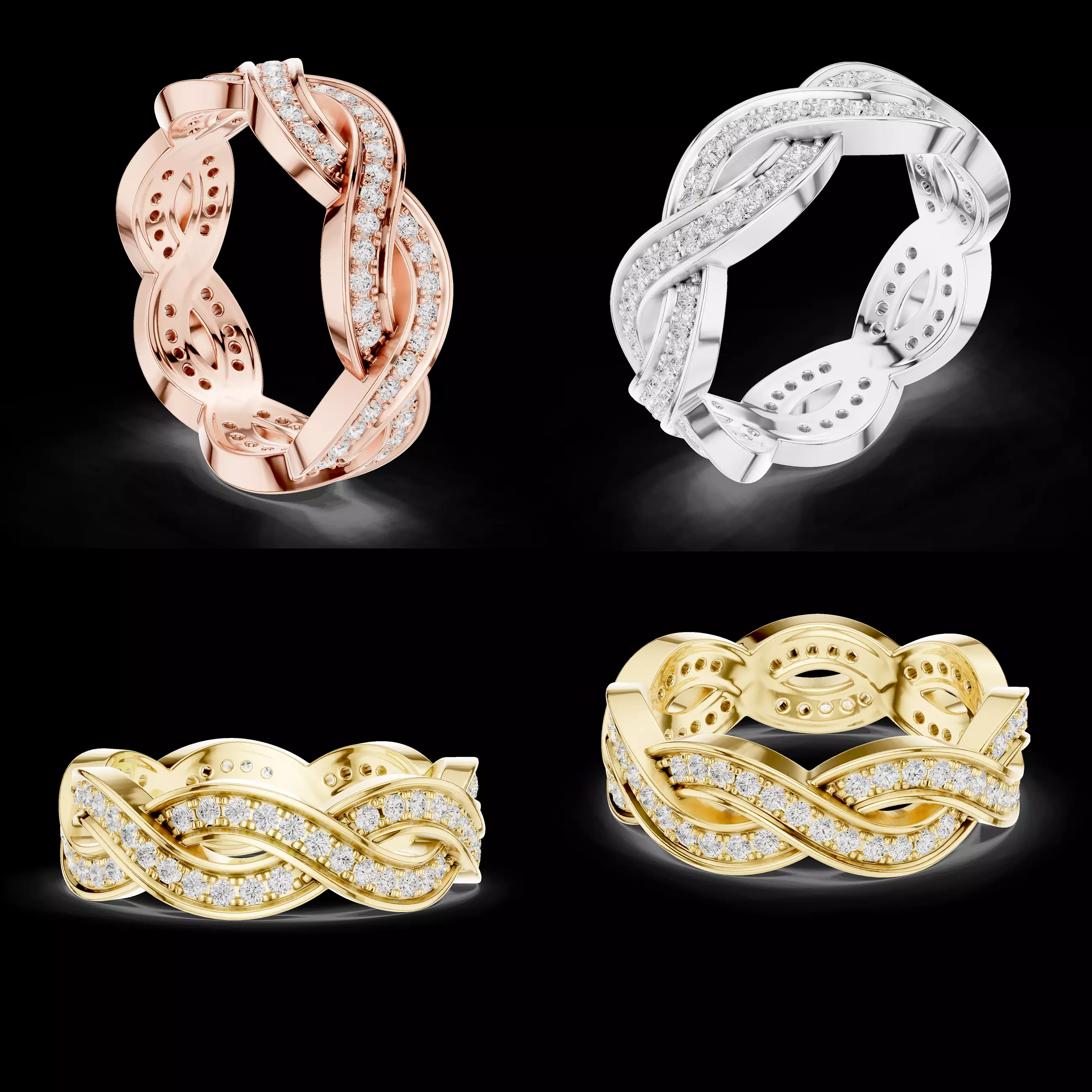 The twisting band structure is enhanced with pavé-set stones along the upper curves, creating a continuous sparkle effect while maintaining smooth metal surfaces for comfort and durability. The inner gallery includes weight-optimized openings that support efficient casting without compromising strength.