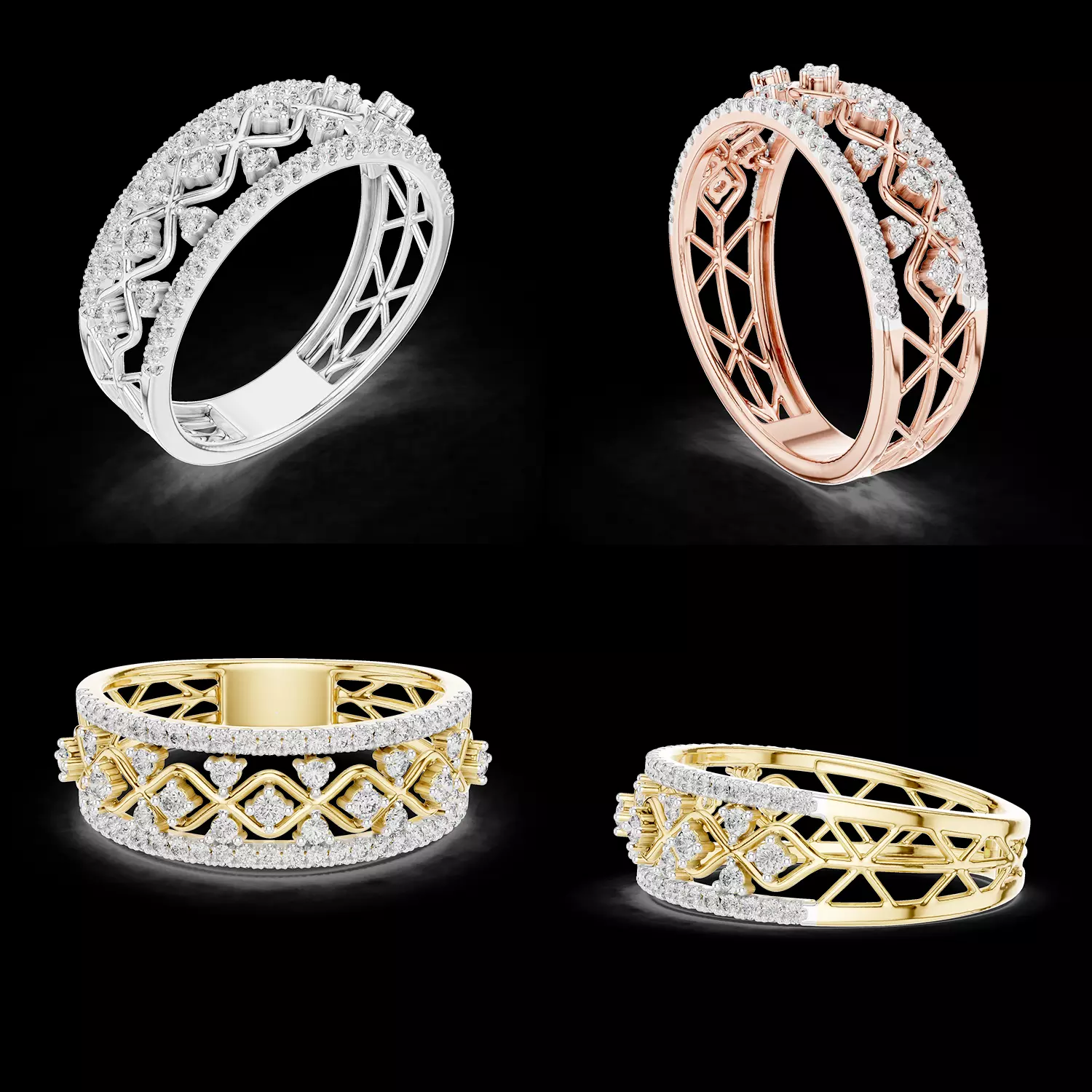This premium wide band ring features a sophisticated lattice structure combined with a continuous diamond setting, creating a perfect balance between modern geometry and luxury aesthetics. The design showcases a double-row diamond arrangement along the edges, while the center band highlights an intricate pattern of alternating shapes that enhance brilliance and visual depth.