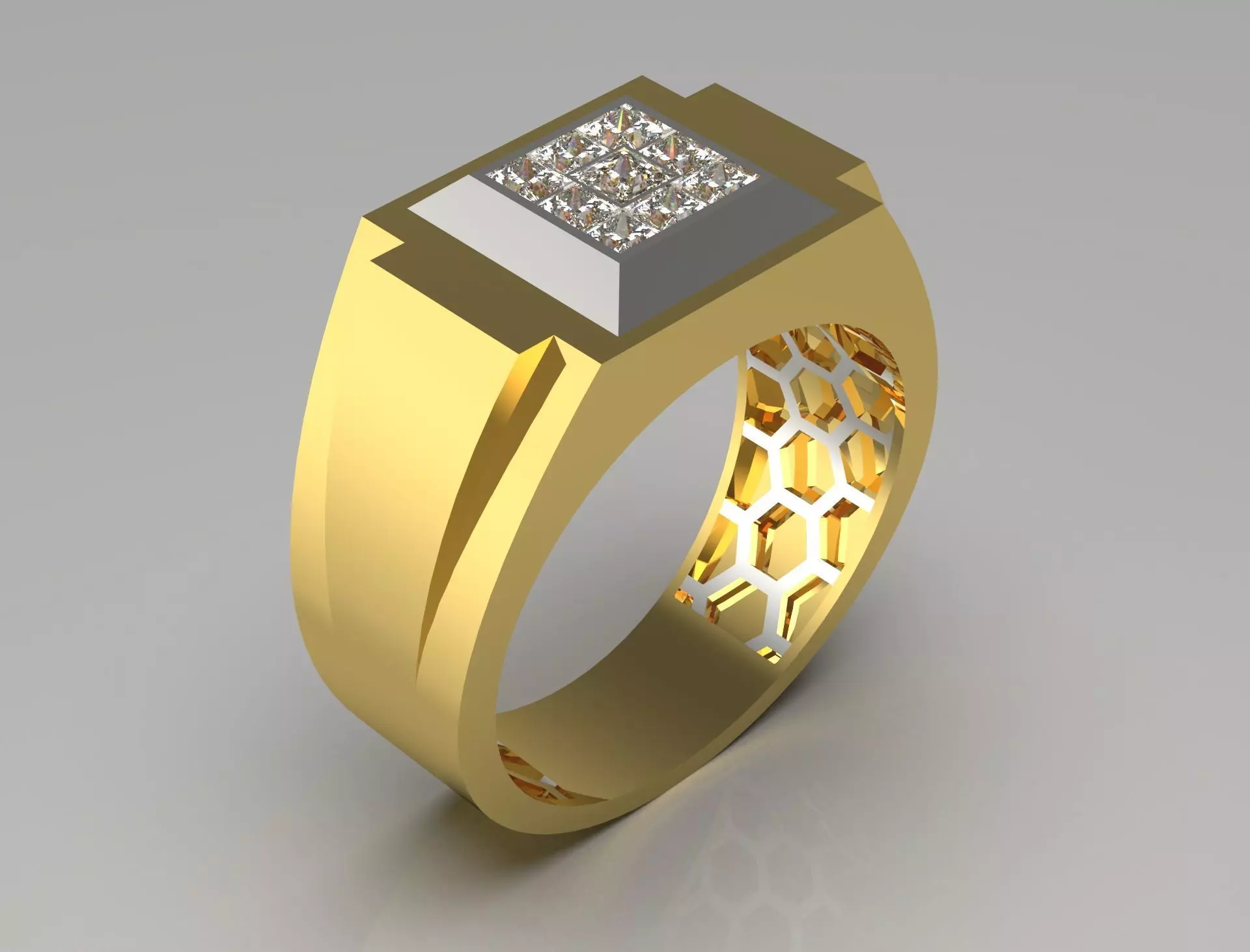 The underside of the band has a unique honeycomb pattern, adding visual interest and a modern touch. This combination of elements contributes to a contemporary look, making it suitable for both casual and formal occasions. Overall, the ring balances elegance with a distinctive flair.