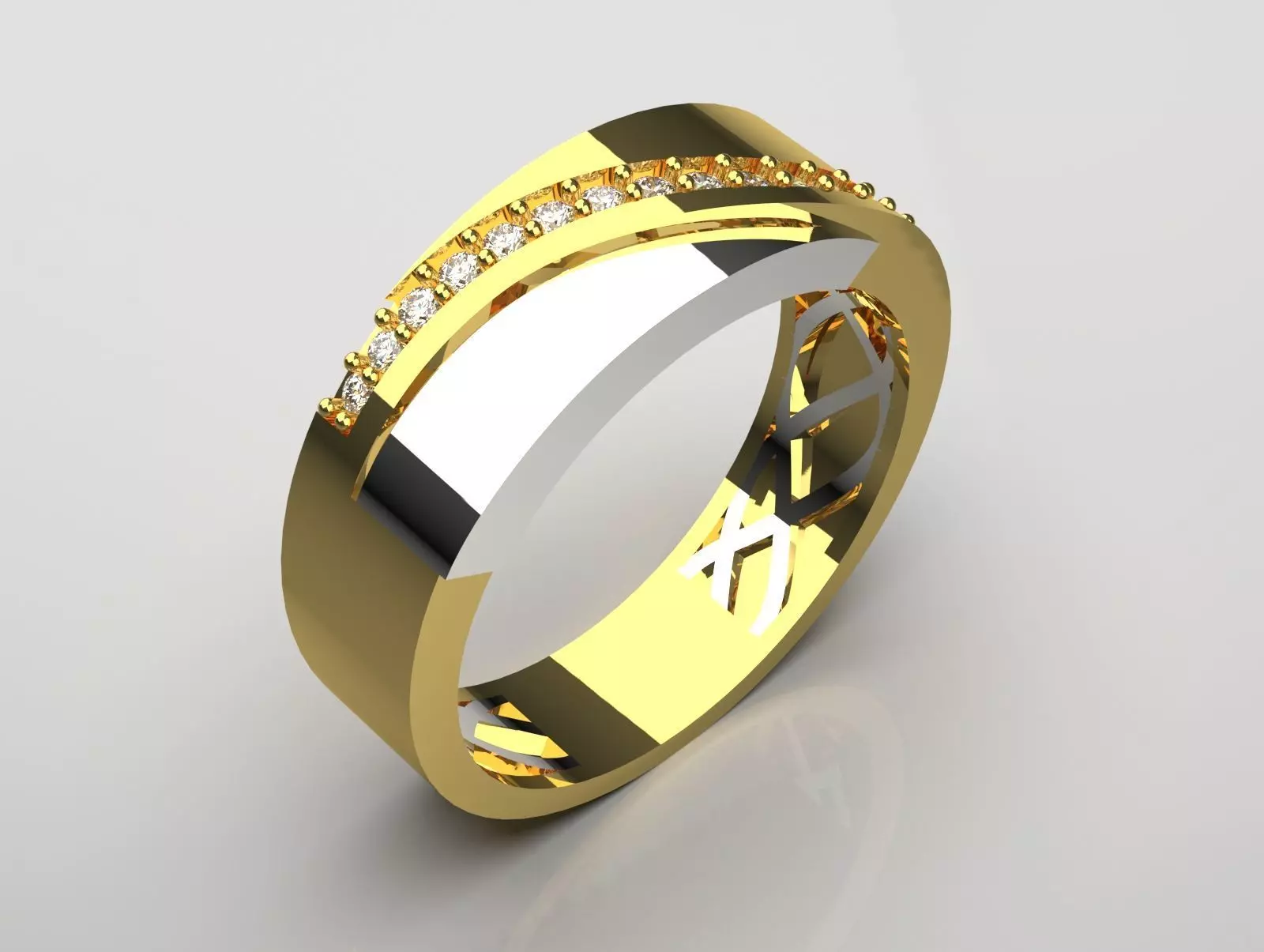 This gold ring has a modern and up-to-date design. On the ring, there is a strip of shiny and sparkling diamonds that are arranged in a regular and aligned line. Inside the ring, there are parts with inscriptions and hexagonal cuts that give a geometric and fashionable look to the design. These parts, along with the golden structure, have created a luxurious and stylish look for this ring, which is suitable for special jewelry and clothing.