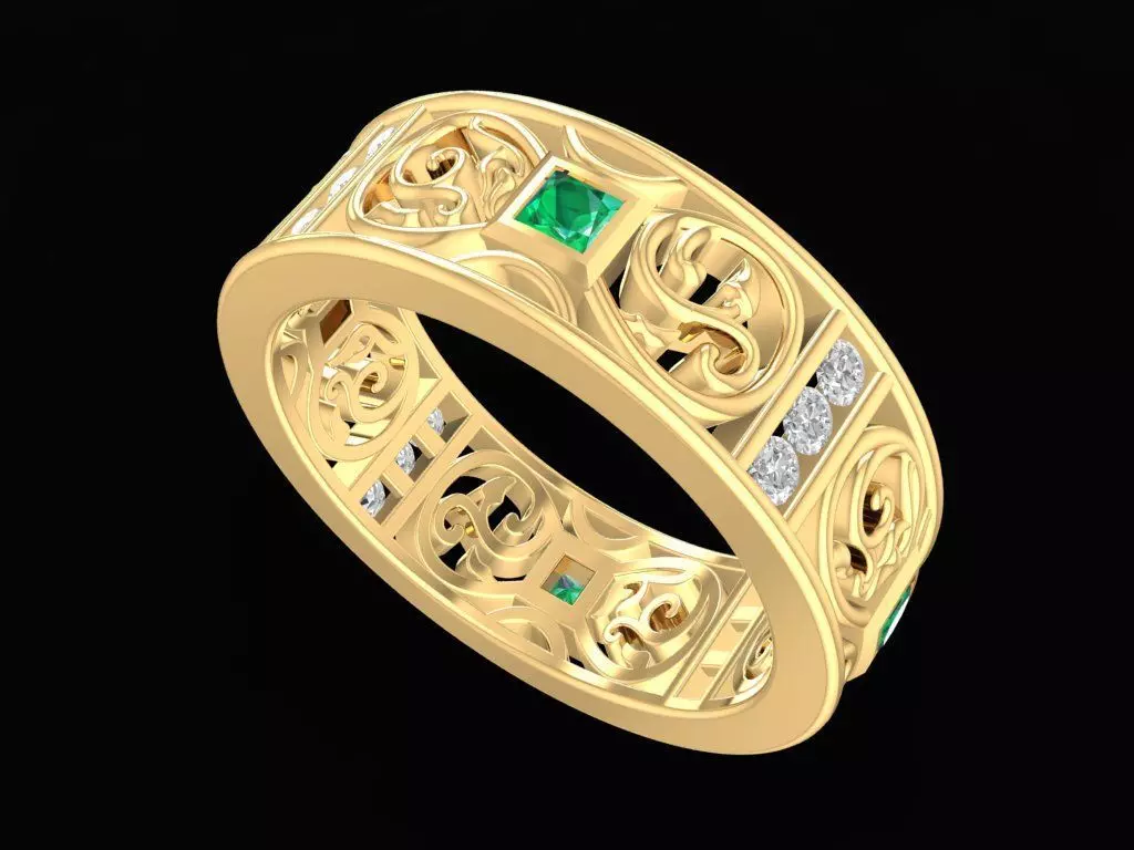 This Elegant Filigree Band Ring features a beautifully sculpted openwork design inspired by classical filigree patterns. The ring showcases a seamless flow of ornamental swirls placed around the band, creating a light, airy, and highly decorative structure. Square-cut accent stones are set strategically along the center for added brilliance, providing a refined balance between vintage detail and modern elegance. The combination of smooth curves, open areas, and clean metal surfaces makes this ring suitable for premium casting in gold, silver, or platinum.