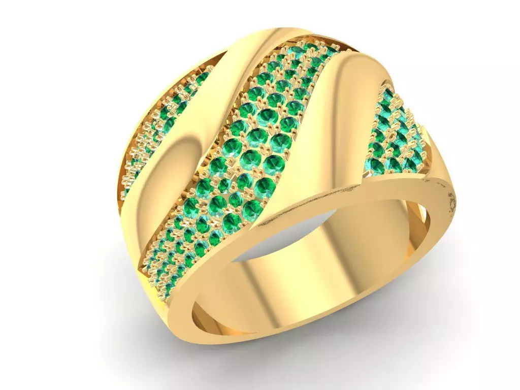 This 3D model features a bold men’s ring with a wide shank and wave-inspired design. The surface is decorated with multiple rows of pave-set emerald stones (or CZ stones), creating a powerful and fashionable look. The alternating wave pattern enhances the play of light and color, making it an eye-catching statement piece for men’s luxury jewelry collections.
