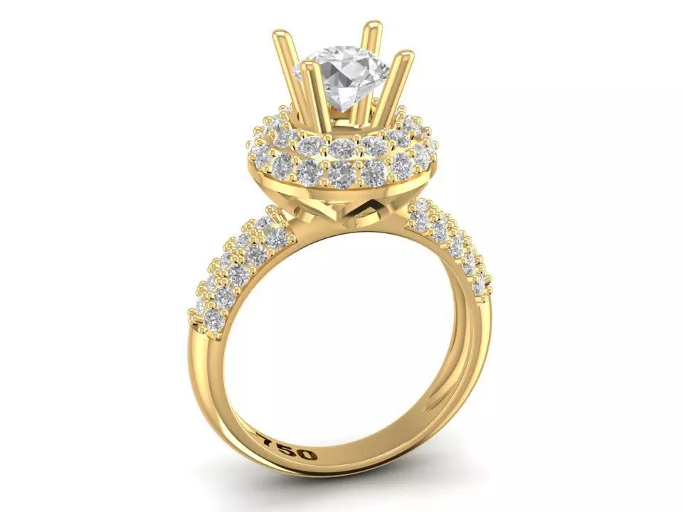 This 3D model showcases a luxury engagement ring design featuring a round cut center stone, surrounded by a double halo of small diamonds and additional side stones along the shank. The combination of halos and pave setting enhances the brilliance, making the ring an ideal choice for engagement, anniversary, or special events.