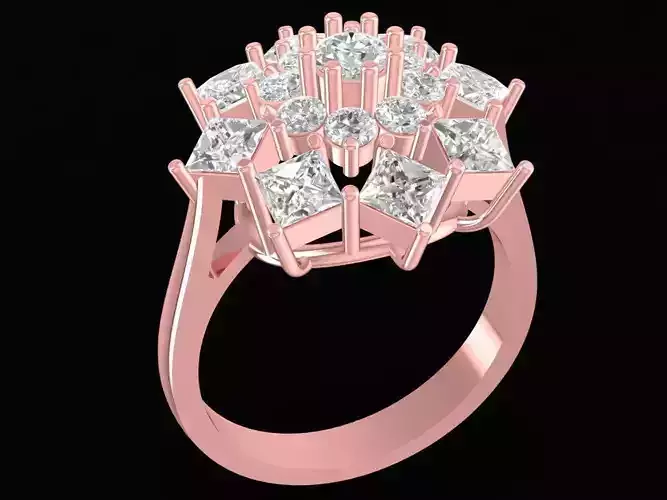 This 3D jewelry model features a luxury snowflake cluster diamond ring for women, designed with a stunning starburst pattern that combines elegance and precision. The centerpiece is composed of multiple round and princess-cut diamonds arranged in a symmetrical floral layout, creating a radiant sparkle from every angle. The ring’s basket setting is reinforced for strength and crafted to maintain perfect alignment of each gemstone.