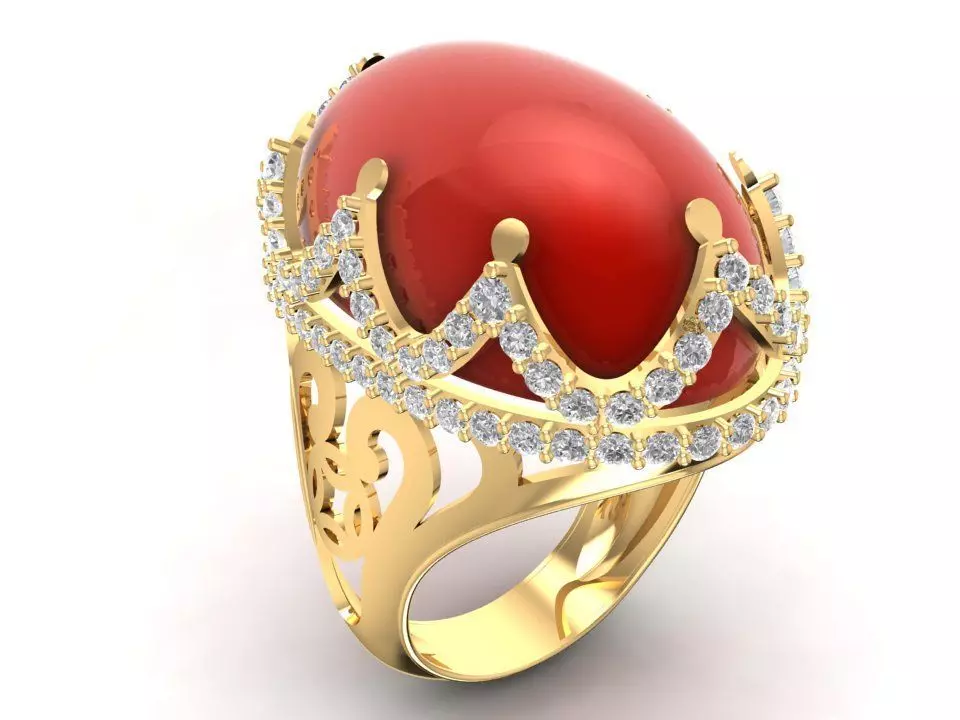 This 3D model features a bold and luxurious men’s ring inspired by royal crown motifs. The centerpiece is a large oval cabochon gemstone, surrounded by a crown-shaped prong setting and highlighted with small diamonds for extra brilliance.