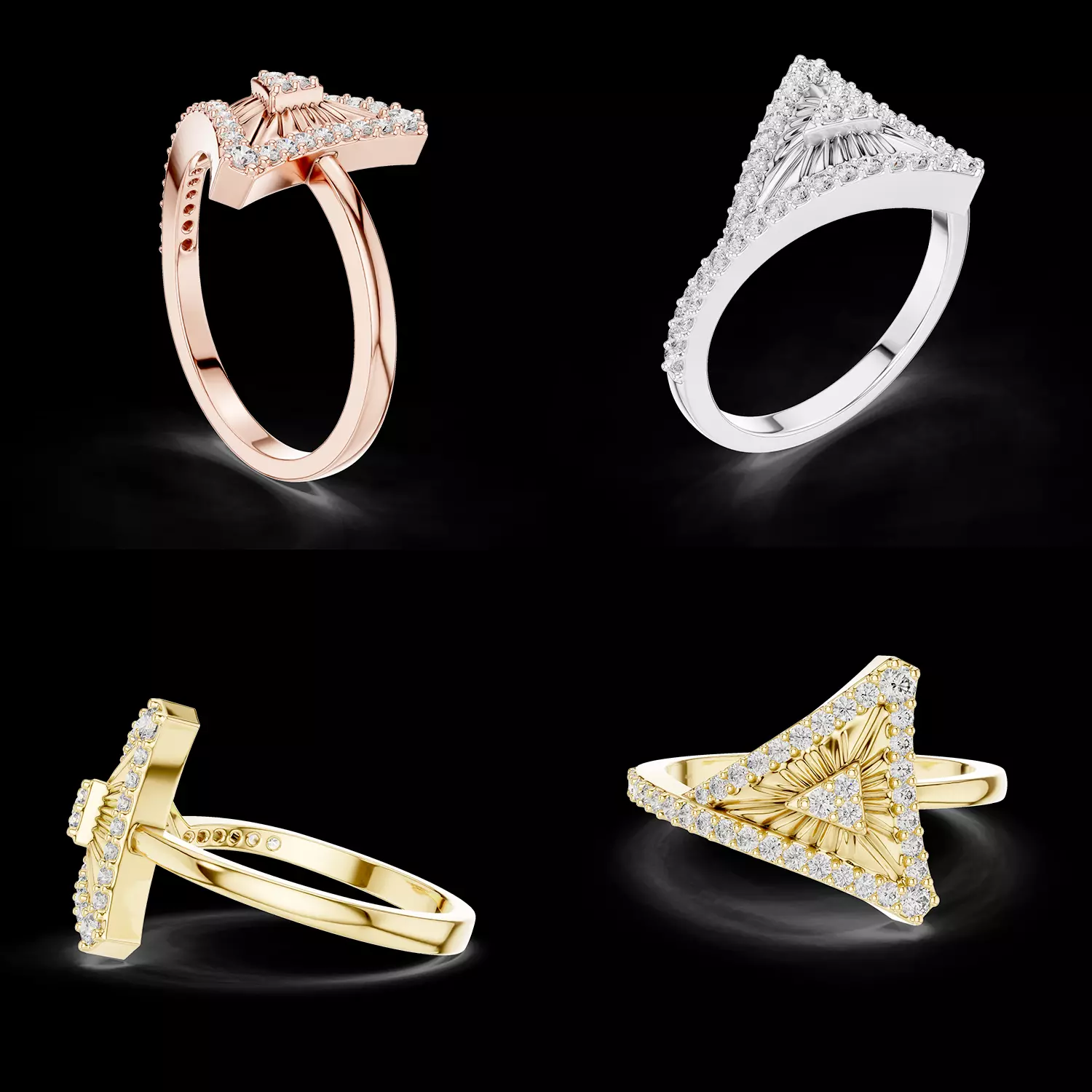 Important PointsHigh-quality and production-ready CAD modelBold triangle geometric statement designDetailed inner pattern for added depthPrecise diamond setting for maximum brillianceSmooth surface for excellent finishingStrong and durable structureEasy customization in 3DM format