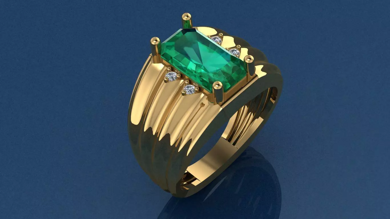 Commanding and refined, this ring showcases a powerful rectangular-cut centerpiece gemstone, elevated by brilliant side accents on a bold, grooved gold band. A design that symbolizes prestige, elegance, and timeless authority.