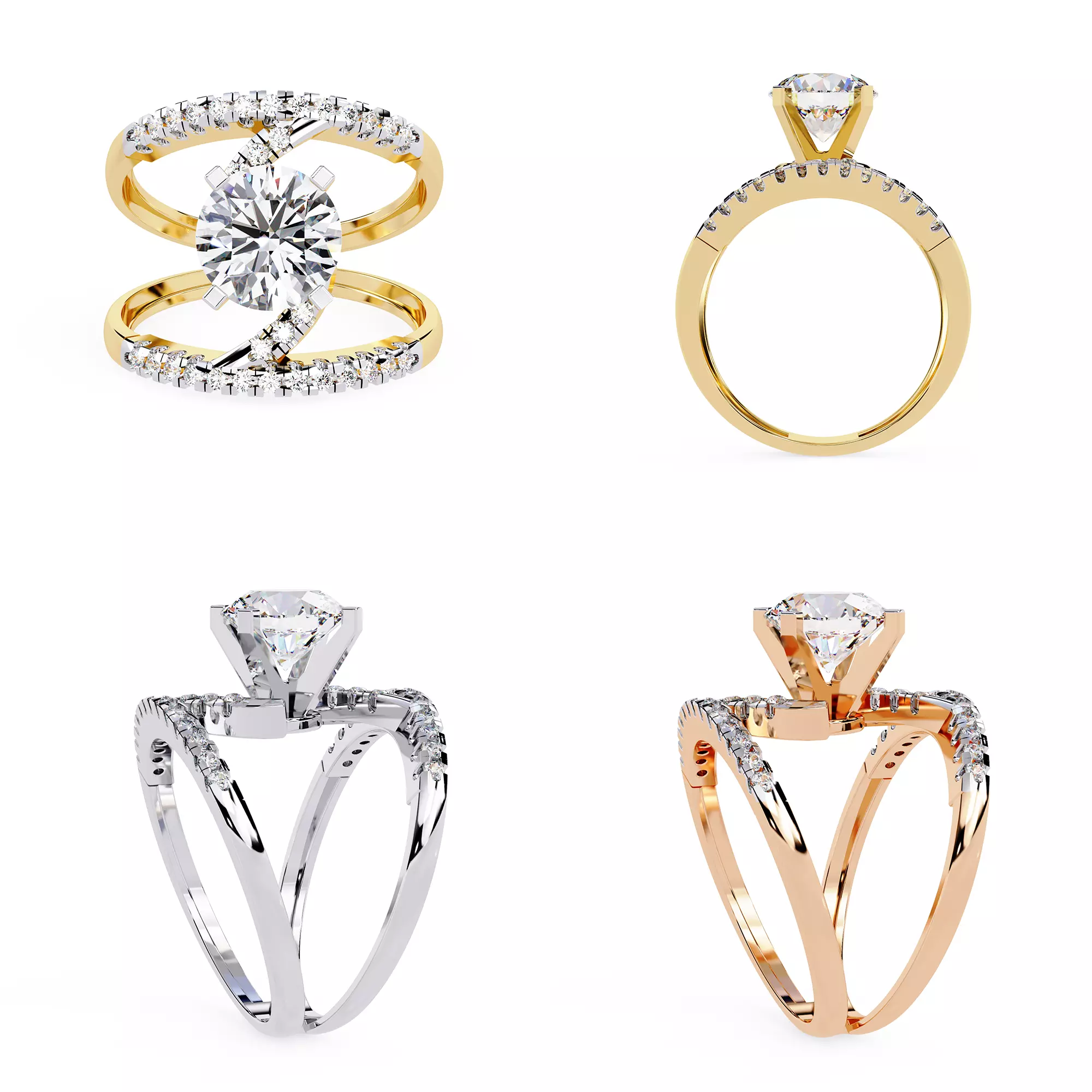 Round brilliant center stone (modifiable) Double-split crossover modern shank Pavé accent stones on upper band No mesh errors – production safe Gold / Platinum / Silver compatible Comfort-wear ergonomic structure