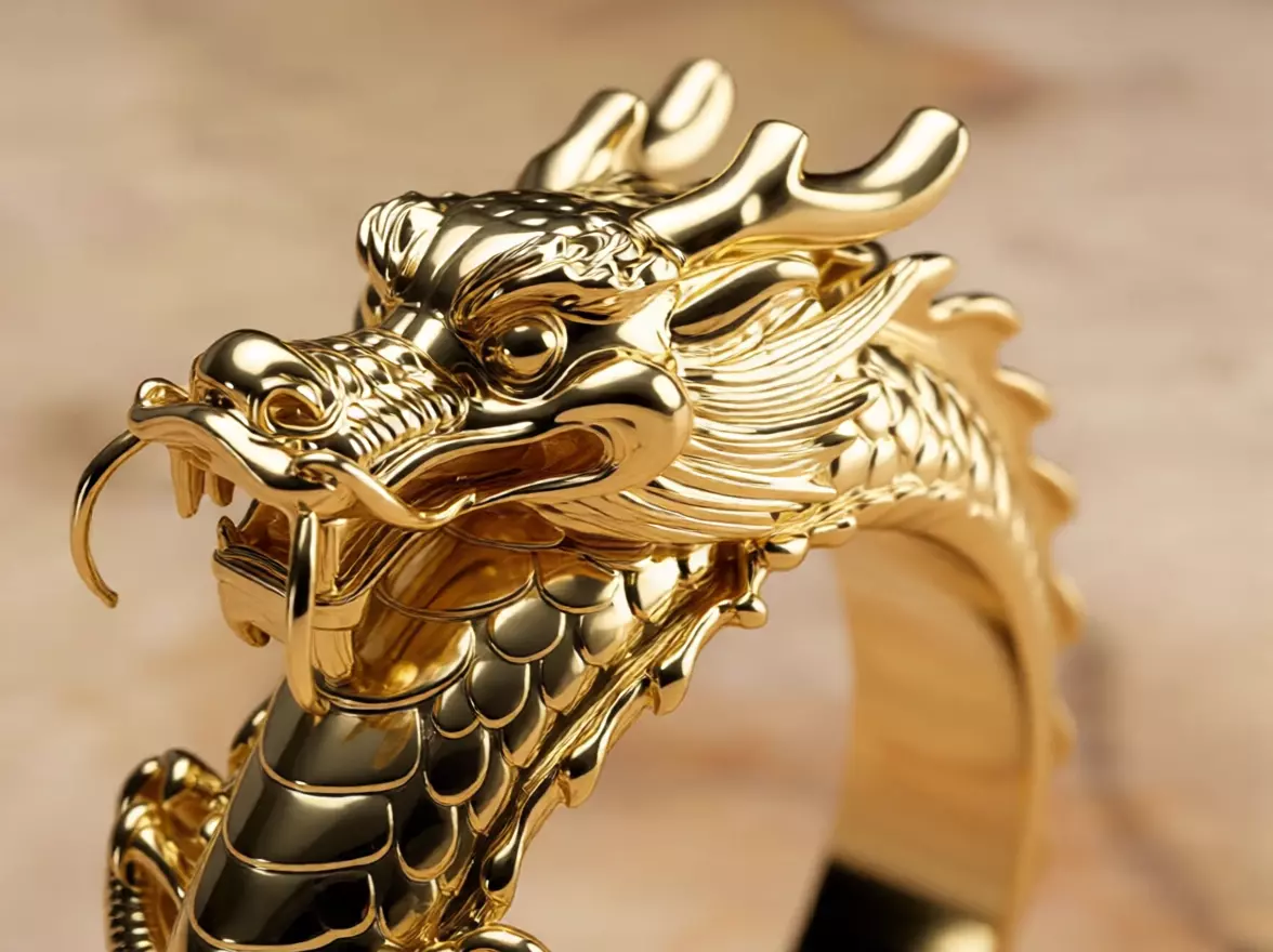 High-detail 3D printable dragon ring inspired by traditional Asian mythology. The model features a fully sculpted dragon wrapping around the band with intricate scales, horns, whiskers, and ornamental facial details.