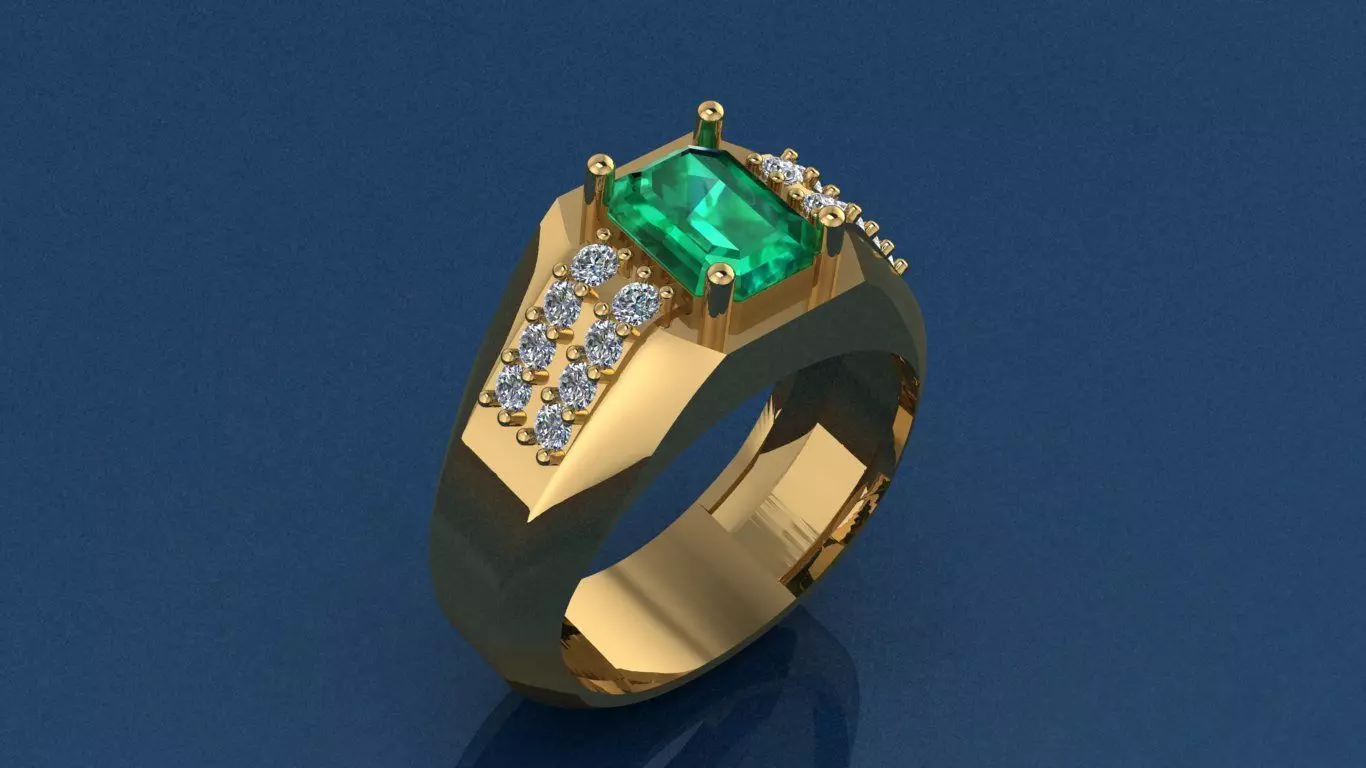 This bold and luxurious ring features a vibrant emerald-cut centerpiece gemstone, elevated by cascading rows of brilliant accent stones along the golden shoulders. With its regal symmetry and refined craftsmanship, the design embodies prestige, and timeless elegance.