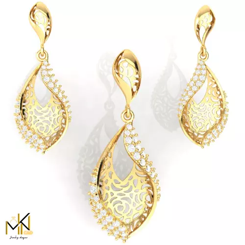 This stunning 3D model features a delicately crafted floral filigree pendant set, adorned with sparkling American Diamonds (AD). Designed with elegant teardrop silhouettes, the pendant and matching earrings showcase a blend of traditional and contemporary aesthetics, making it ideal for formal, bridal, or festive wear.