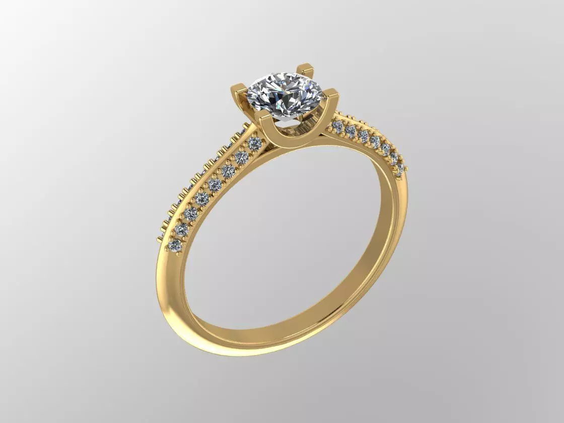 This elegant solitaire ring features a classic round center stone held by a four-prong setting, complemented by a pavé band with small accent stones along the shank. The design combines timeless aesthetics with modern proportions, making it perfect for engagement rings, jewelry visualization, advertising renders, and production preparation.