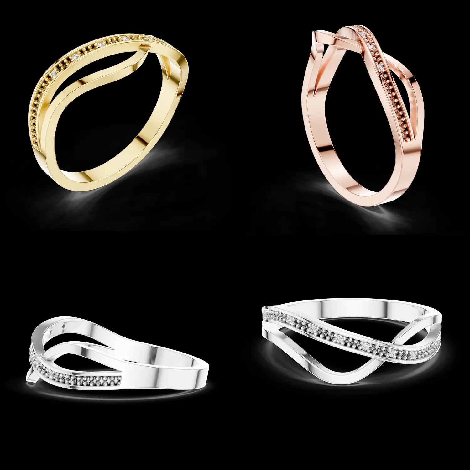 One side of the wave is accented with precisely set round diamonds, while the opposite band features refined bead detailing that enhances texture and visual depth. The open crossover structure adds dimension and movement, making the ring stand out from traditional straight-band designs.