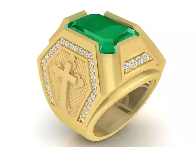 This luxury Christian cross men ring 3D model is designed as a bold signet ring symbolizing faith, strength, and devotion. The centerpiece features a rectangular emerald-cut gemstone, with alternative gemstone color options shown in the preview images for customization.