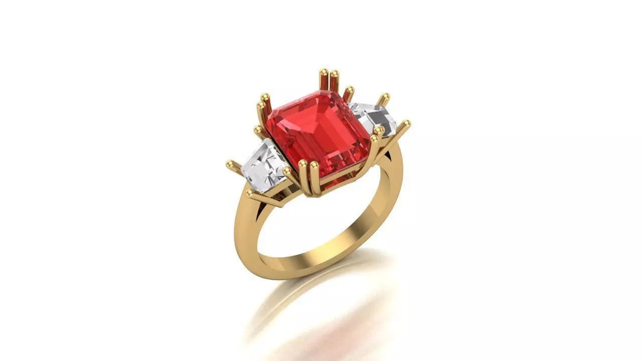 Flanking the center stone are two smaller side stones, likely diamonds, each cut in a baguette or trapezoid shape. These side stones, with their elongated and geometric forms, complement the emerald cut center stone, adding a touch of contemporary elegance and balance to the design. Their placement creates a sense of symmetry and harmony, enhancing the ring's overall aesthetic.