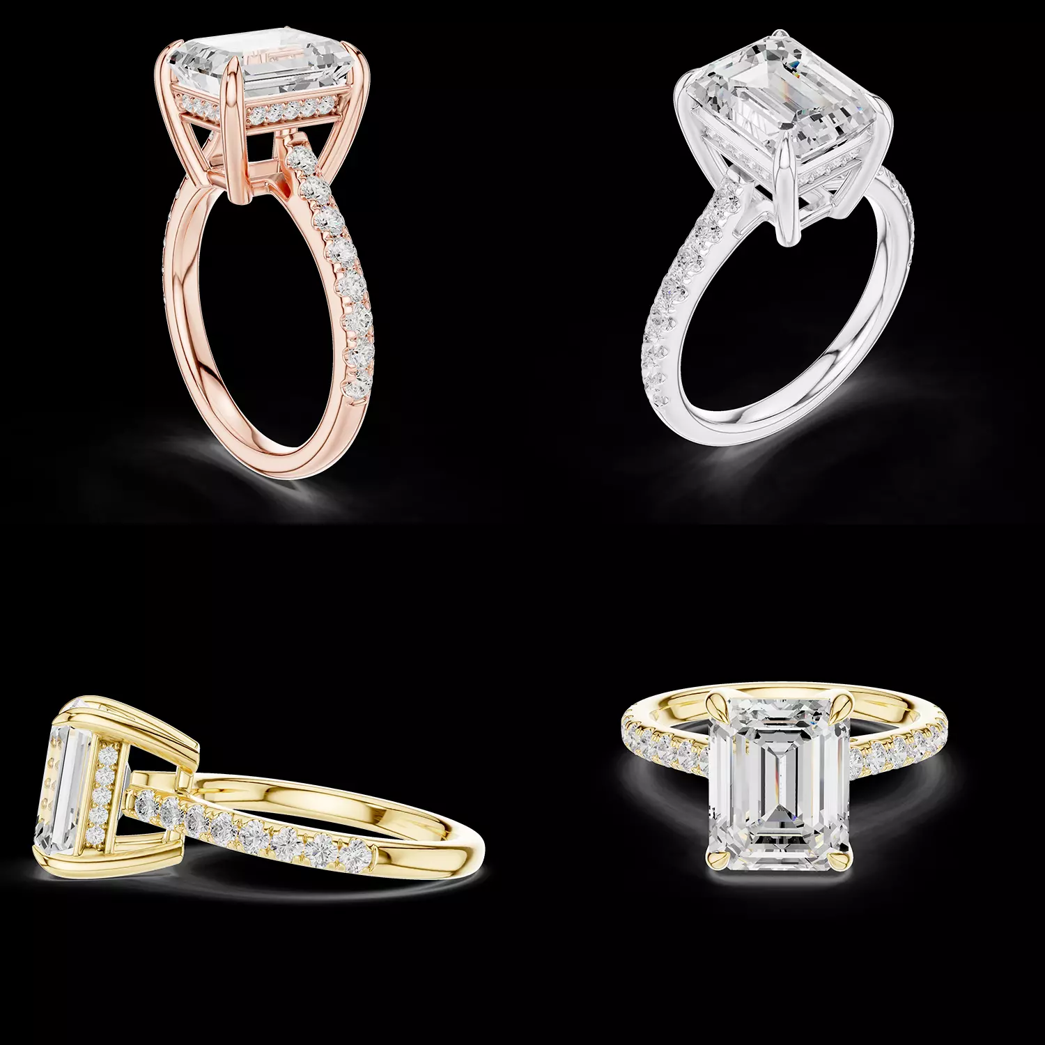 Introducing a refined Emerald Cut Hidden Halo Engagement Ring CAD model, designed with a clean architectural structure and modern elevated setting. This ring features a stunning emerald cut center stone secured with four strong claw prongs, highlighting the stone’s step-cut facets and elegant symmetry.
