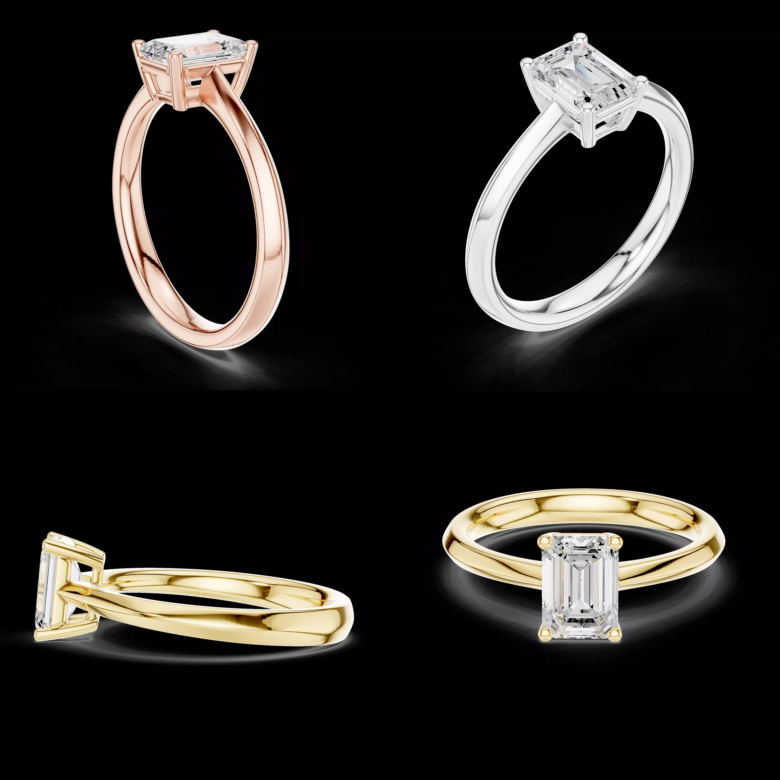 This elegant solitaire engagement ring showcases a sophisticated emerald-cut center stone held securely in a classic four-prong setting. The design emphasizes clean geometry and balanced proportions, allowing the elongated emerald-cut stone to stand out with refined brilliance and a timeless luxury appearance.