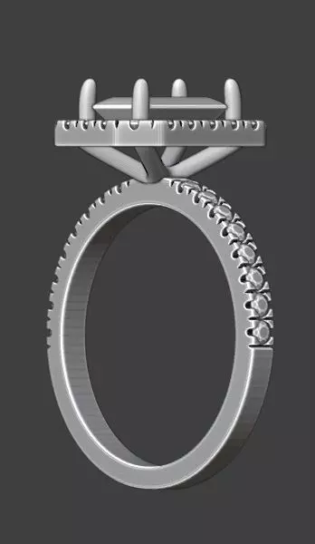 The jewel in the image is a single-stone 3D printed rosette ring model, which features a central emerald cut stone surrounded by smaller stones (halo) and additional stones in its shank.Such rings are usually made of 14K or 18K white gold and are decorated with either diamonds or zircon stones.