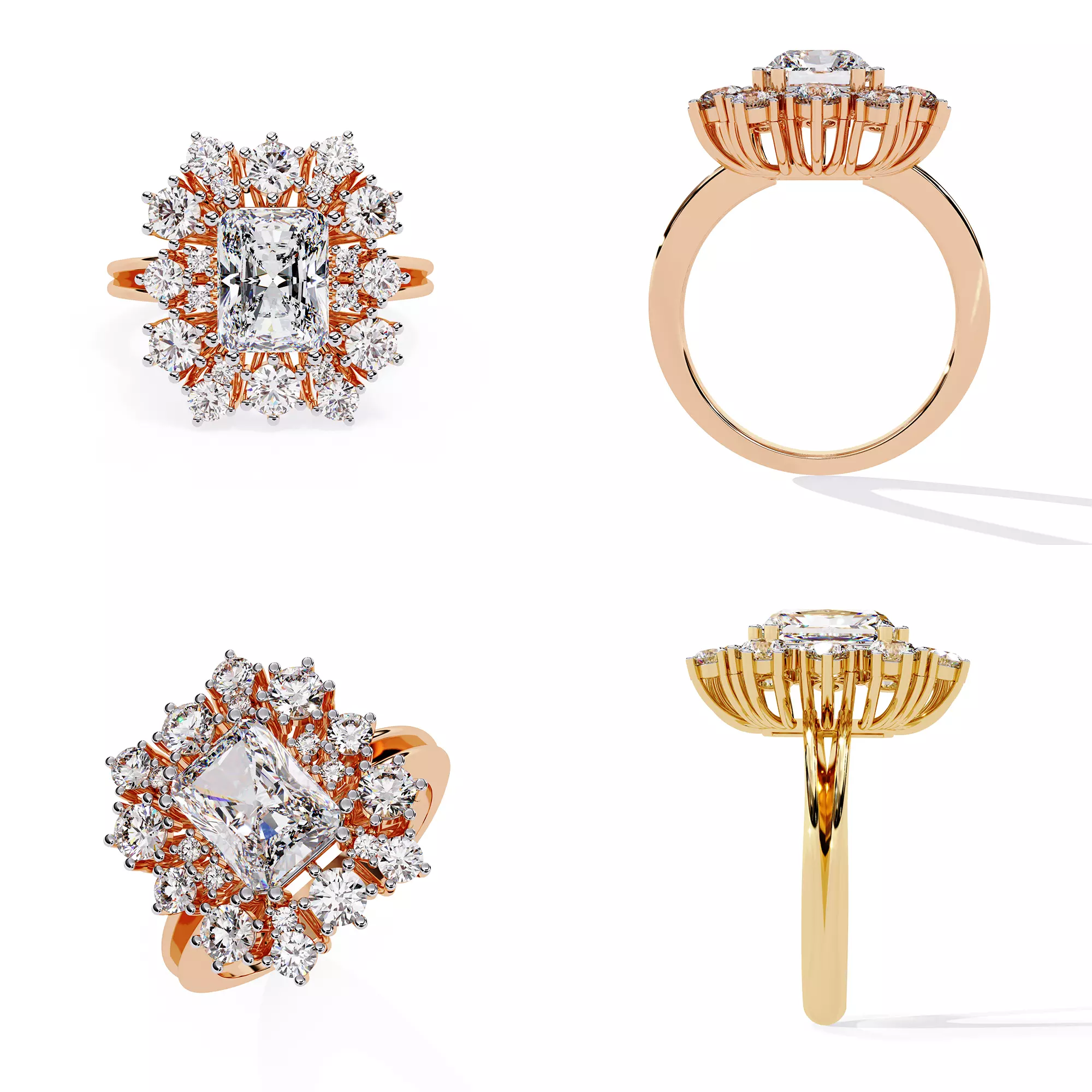 Emerald-cut center stone (editable in CAD) Full halo in sunburst star formation Open prong structural gallery for maximum sparkle Smooth & clean topology, no mesh errors Gold / Silver / Platinum manufacturing compatible Accurate stone seats for real diamond setting