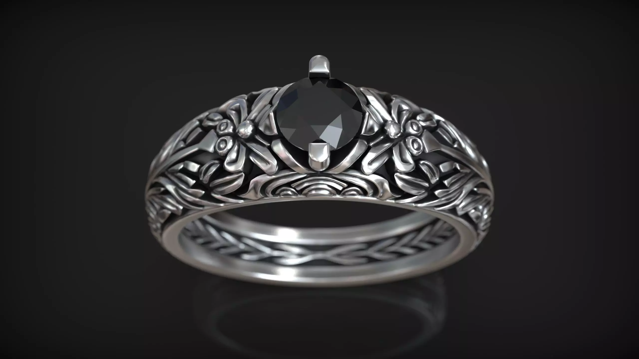 This 3D model features a bold and richly detailed ring with a dark central stone, set in a four-prong setting. The entire shank is adorned with high-relief floral engravings, symmetrical leaf motifs, and layered organic textures that wrap elegantly around the band. The inner surface of the ring includes a braided pattern, adding extra refinement and a hidden detail for collectors or designers.
