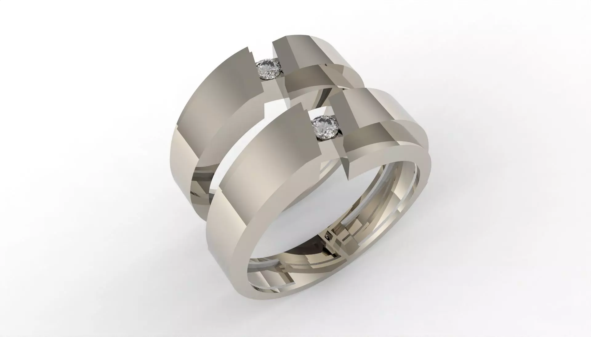 Two souls, one design.This contemporary wedding ring set symbolizes perfect harmony — where masculine strength meets feminine grace.Crafted in polished white gold with precision-cut geometry, each band holds a brilliant diamond at its center, representing the unbreakable bond of love. The mirrored design captures the beauty of unity and equality, making it more than jewelry — it’s a timeless statement of shared destiny.Minimal, modern, and meaningful — the essence of eternal connection.Men's ring size:61 EoruWomen's ring size:54 EoruFor any edit or revision: DM +447301387795 / +447350761213 or elpouriapaypal@gmail.com