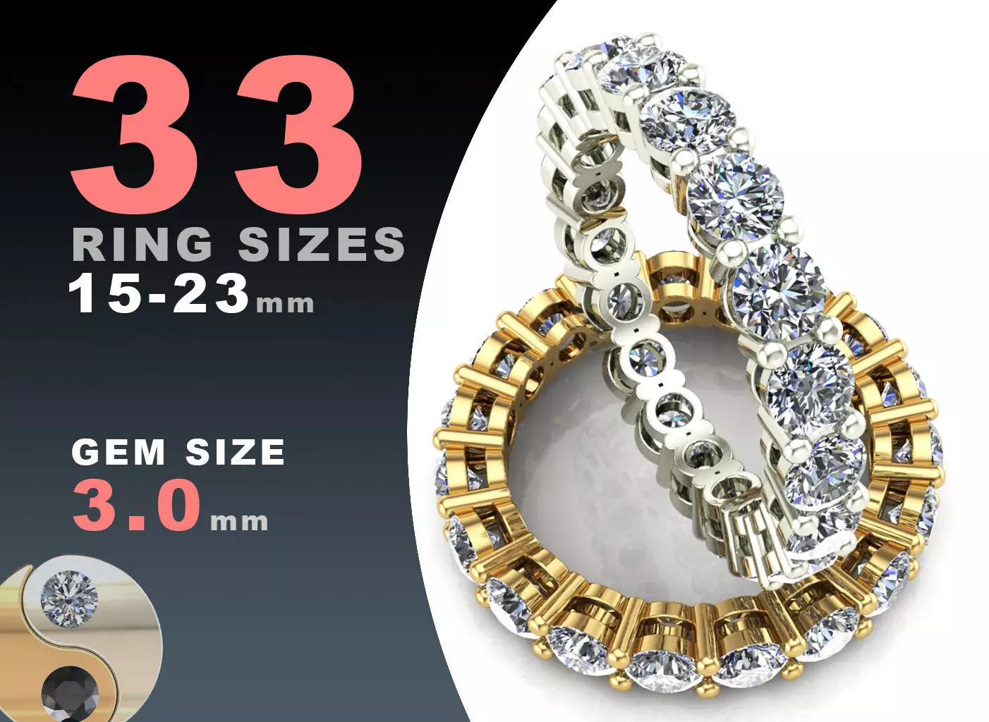 Finger size diameters (mm): from 15.0 till 23.0 in increments 0,25 mmWeight in 14K gold is from 2.1 g (size 15.0) till 3.0 (size 23.0)Stones, used here are 3.0 mm. Number of stones is from 19 pc (size 15.0) till 27 pc (size 23.0) and shown in a model.All models are in one .3DM / .STL / .OBJ / FBX file.