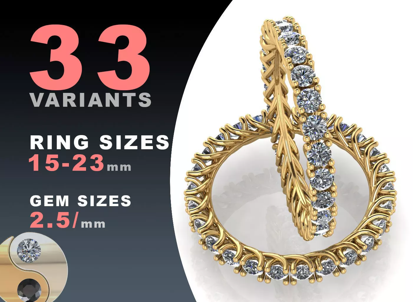 Gems, used here are 2.5 mm. Number of stones is from 23 pcs (size 15.0) till 32 pcs (size 23.0)