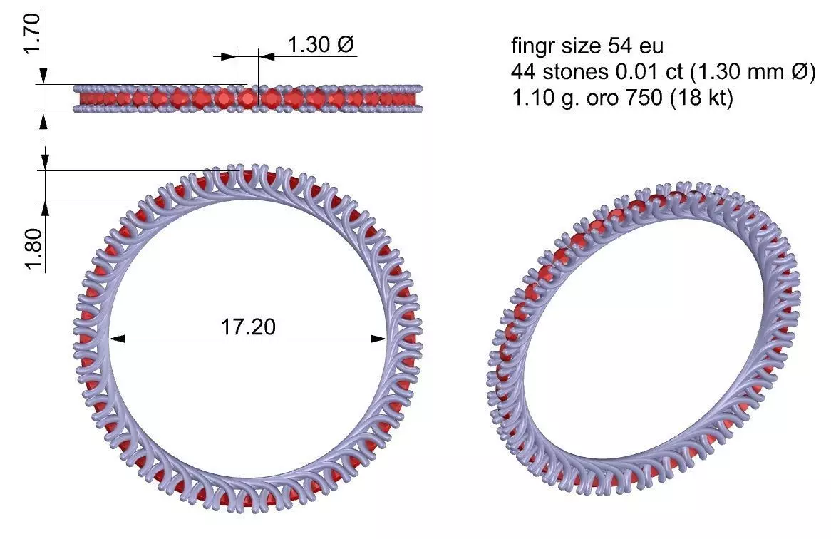 misura dito 54 eu (17.20 mm);32 pietre da 0.03 ct (1.90 mm);1.50g oro 750 (18kt);pronto alla stampa e alla fusione in metallo;formato STL con supporti per fusione;formato OBJ con supporti per fusione;formato 3dm senza supporti per fusione;