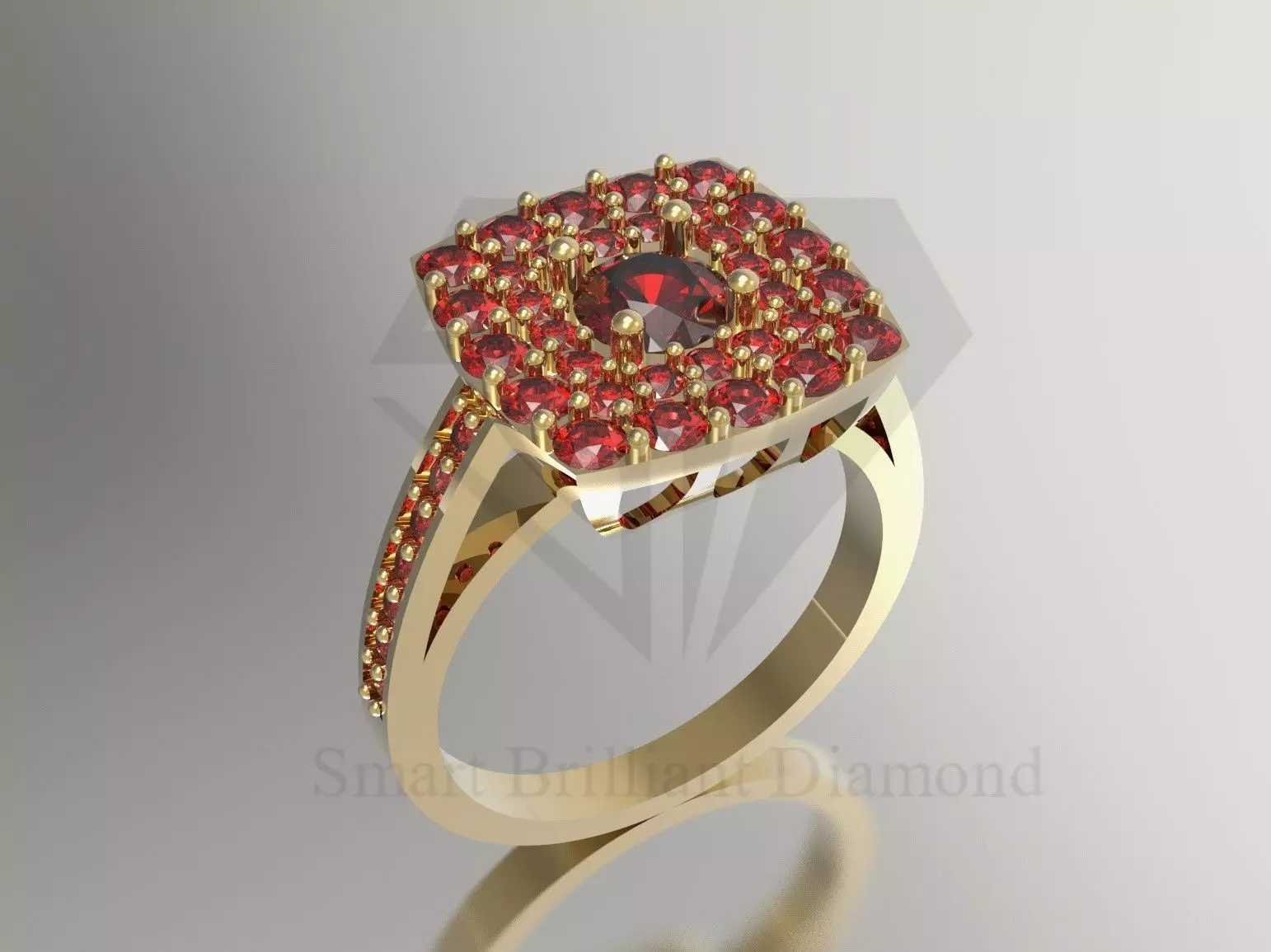 Design a beautiful and striking engagement ring with this unique 3D printable STL file. This stunning ring features a bold square-shaped setting adorned with red gemstones around a central stone, all set in a polished yellow gold band. The intricate detailing and gemstone arrangement make this ring a perfect choice for someone looking for a distinctive and luxurious piece of jewelry.