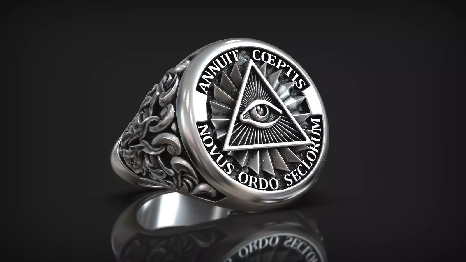 This 3D model features a men's signet ring with the Eye of Providence symbol prominently displayed on the top. The sides are adorned with intricate vintage ornamentation, adding a timeless and sophisticated touch. Combining symbolic depth with elegant design, this ring is a striking accessory for those who appreciate meaningful and classic aesthetics.