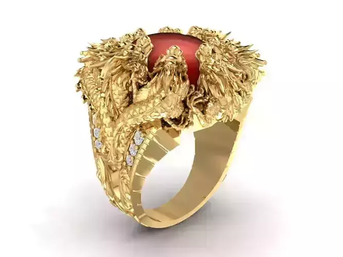 This 3D model presents a bold dragon head men’s ring featuring an intricate design with a large central gemstone and detailed scales. The dragon motif represents strength, power, and protection, making it a perfect statement piece for fine jewelry collections or custom orders.
