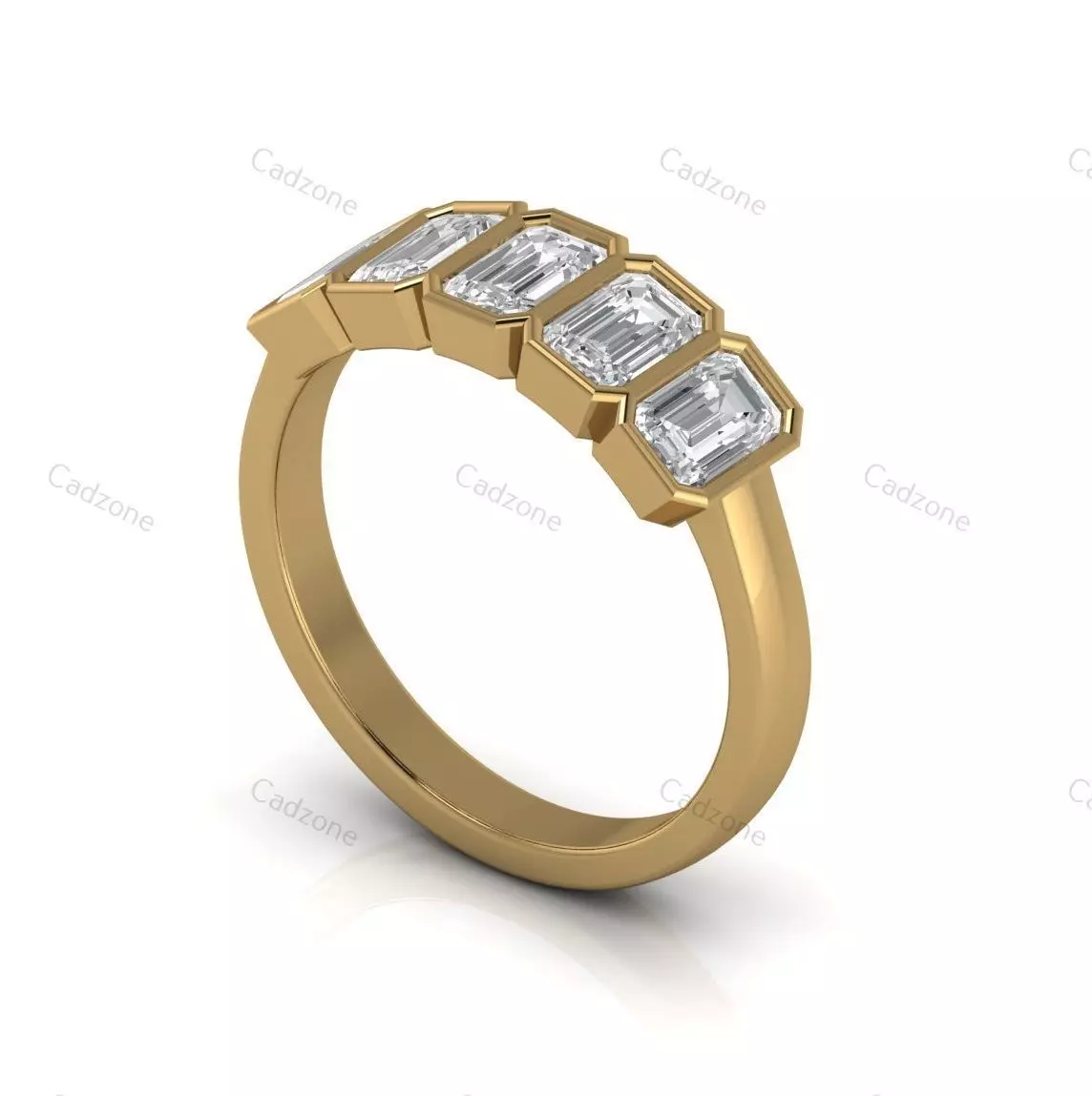 This stunning 3D model showcases a bold and elegant ring featuring five emerald-cut diamonds set in a sleek 14K yellow gold band. The multi-stone design offers a modern and luxurious appeal, perfect for any special occasion or as a statement piece. Ideal for 3D printing and jewelry customization, this ring can be used as an engagement ring, anniversary ring, or fashion accessory.