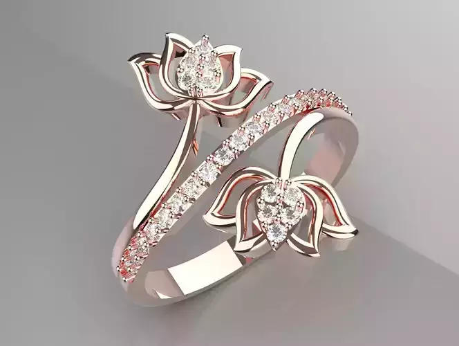 The image showcases a delicate rose gold ring featuring a floral design. The ring is elegantly shaped with two stylized lotus flowers at the ends, each adorned with sparkling gemstones that resemble diamonds. A row of smaller stones runs along the band, adding to the overall brilliance and sophistication of the piece. The intertwining design creates a graceful and romantic look, making it a beautiful choice for special occasions or as a statement accessory.