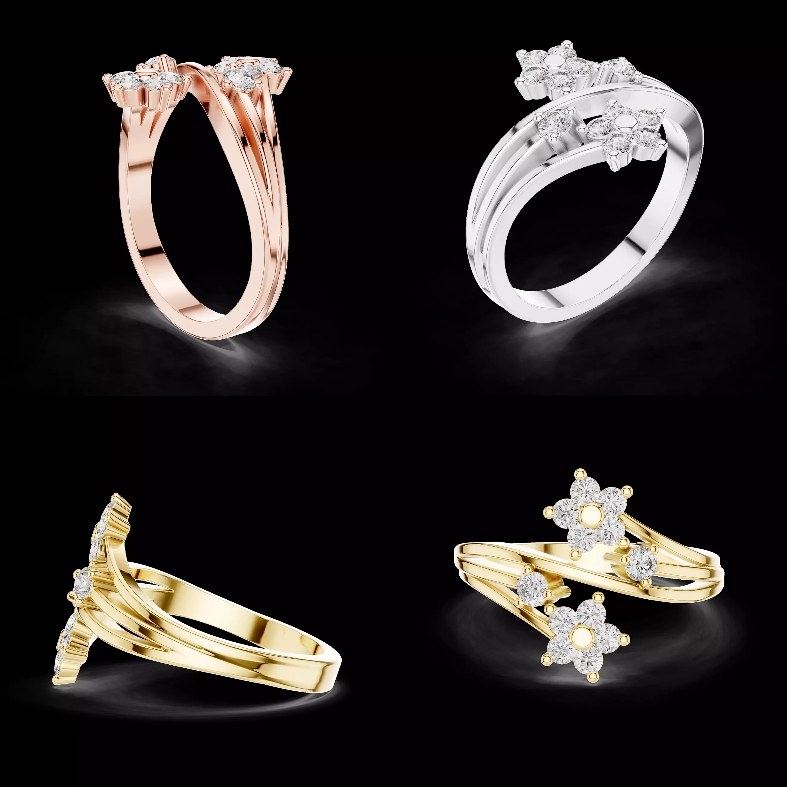 This elegant floral cluster ring features beautifully arranged flower-style diamond heads placed on a graceful crossover shank. The design blends soft organic aesthetics with modern structure, creating a romantic and luxurious appearance ideal for fine jewellery collections.
