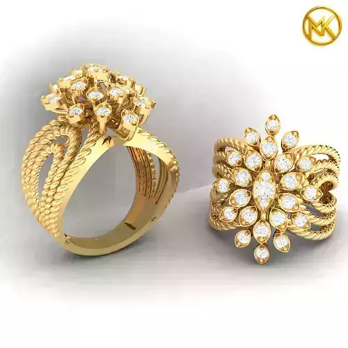 This luxury 3D gold ring model features a bold floral-inspired diamond cluster set on an intricately braided shank, giving it a unique and eye-catching appearance. Designed for jewelry CAD designers, manufacturers, and 3D artists, this high-quality model is perfect for realistic rendering, visualization, and 3D printing applications.