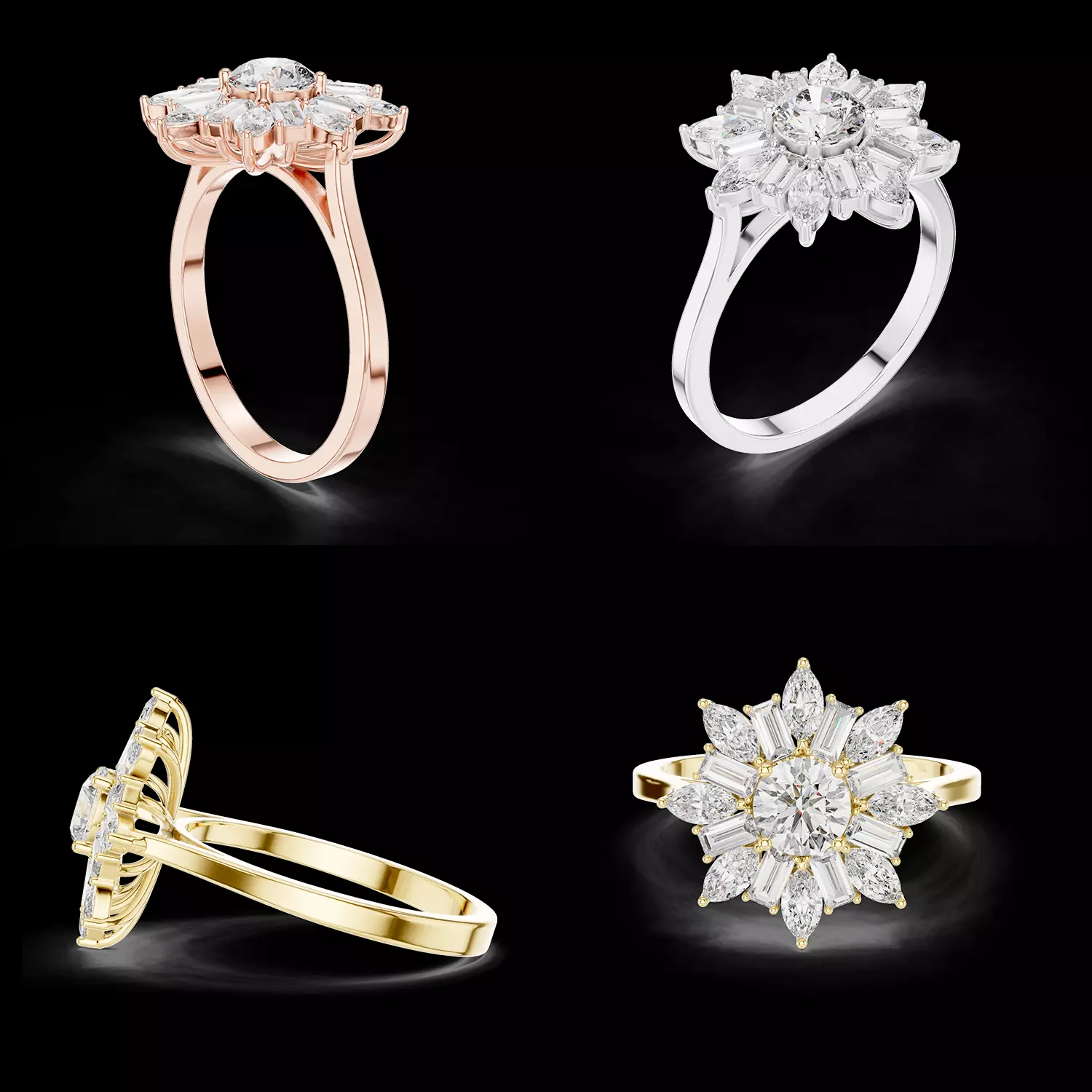 This floral-inspired engagement ring 3D model showcases a brilliant round center stone surrounded by a beautifully arranged cluster of marquise and baguette-cut diamonds, forming an elegant flower-shaped halo. The design delivers a luxurious and eye-catching appearance suitable for high-end engagement and statement jewellery collections.
