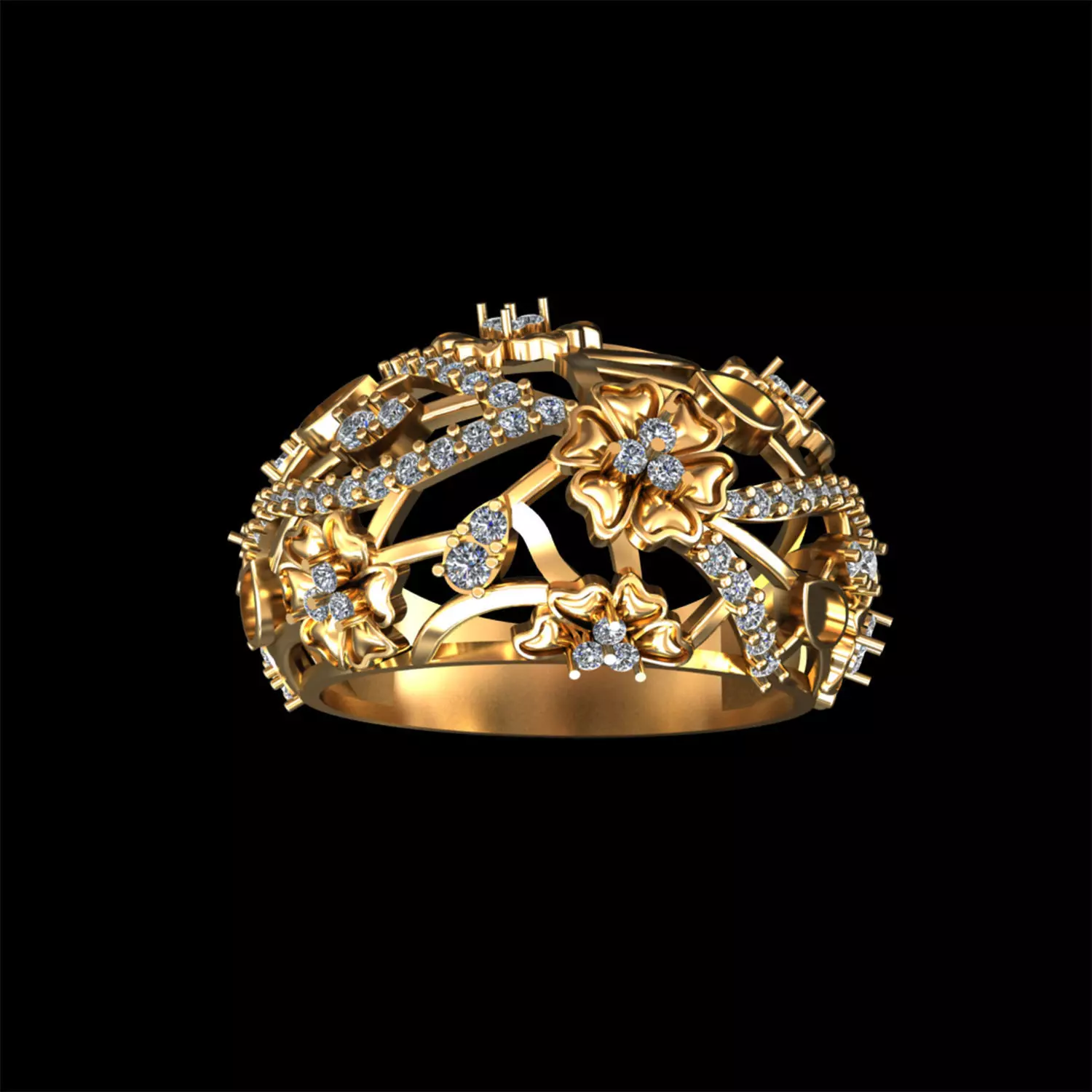 This elegant floral diamond ring CAD model features an intricate openwork design inspired by blooming flowers and flowing organic lines. The ring showcases multiple floral motifs accented with pavé-set round diamonds, creating a luxurious, feminine, and timeless look.