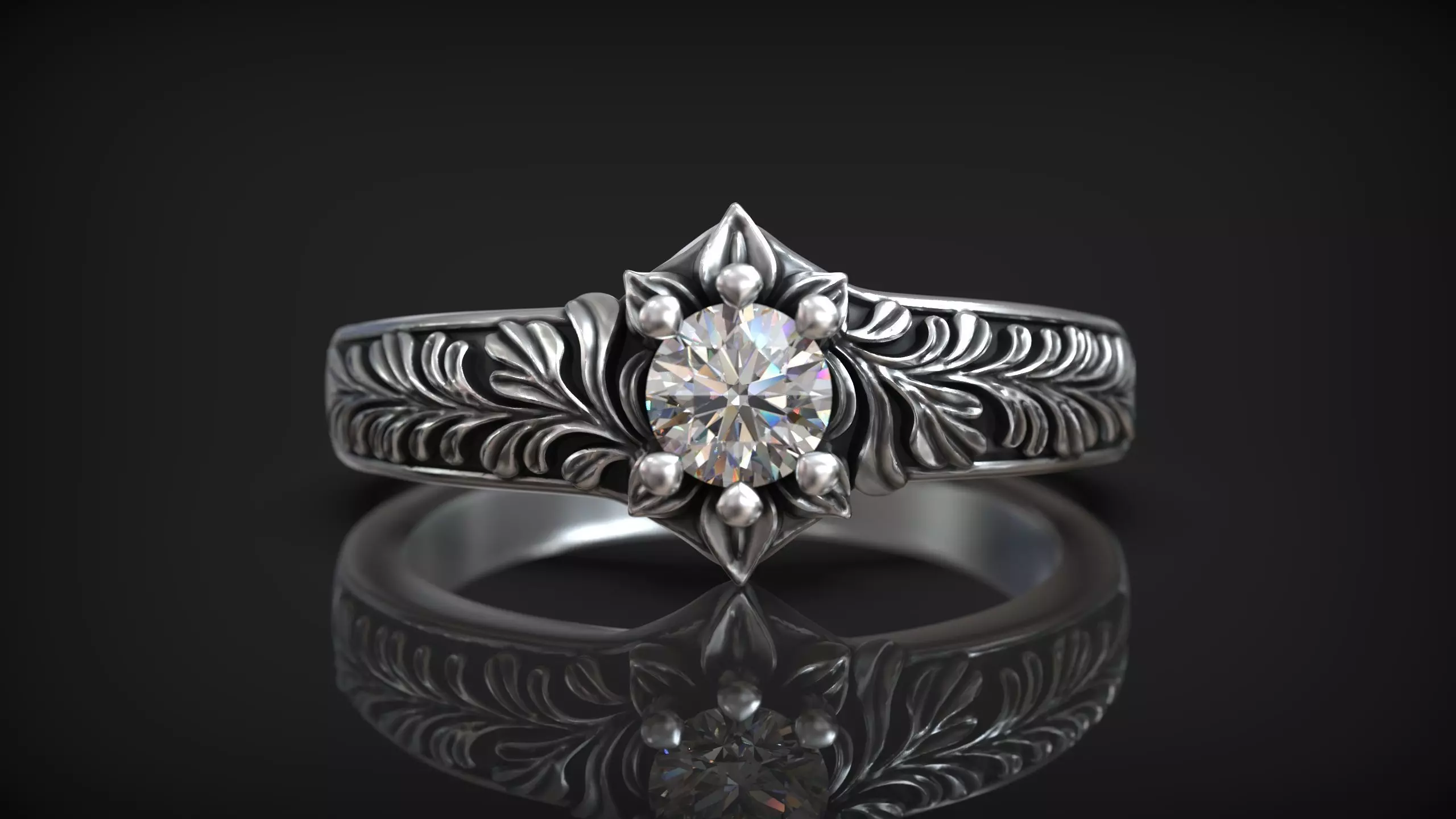 This elegant 3D model features a nature-inspired engagement ring with a refined and symmetrical botanical design. The shank is deeply engraved with flowing leaf patterns on both sides, giving the band a textured, organic character. At the center sits a round brilliant-cut diamond, set in an elaborate six-prong setting that echoes floral and leaf forms, creating a visually harmonious and symbolic focal point.